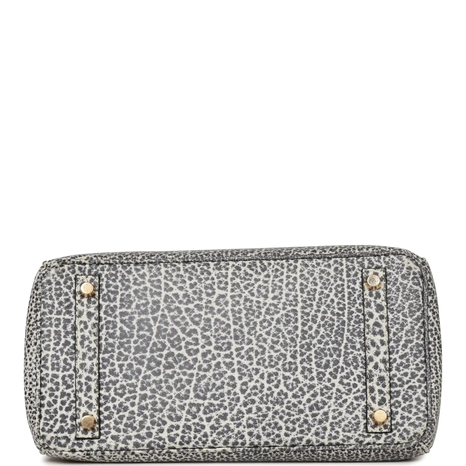この希少なヴィンテージバーキンは、ホワイトのダルメシアンバッファローレザーにゴールドの金具をあしらったデザインで、同系色のステッチ、フロントのトグル開閉、鍵2本とロック付きのクロシェット、そしてダブルロールハンドルが特徴です。