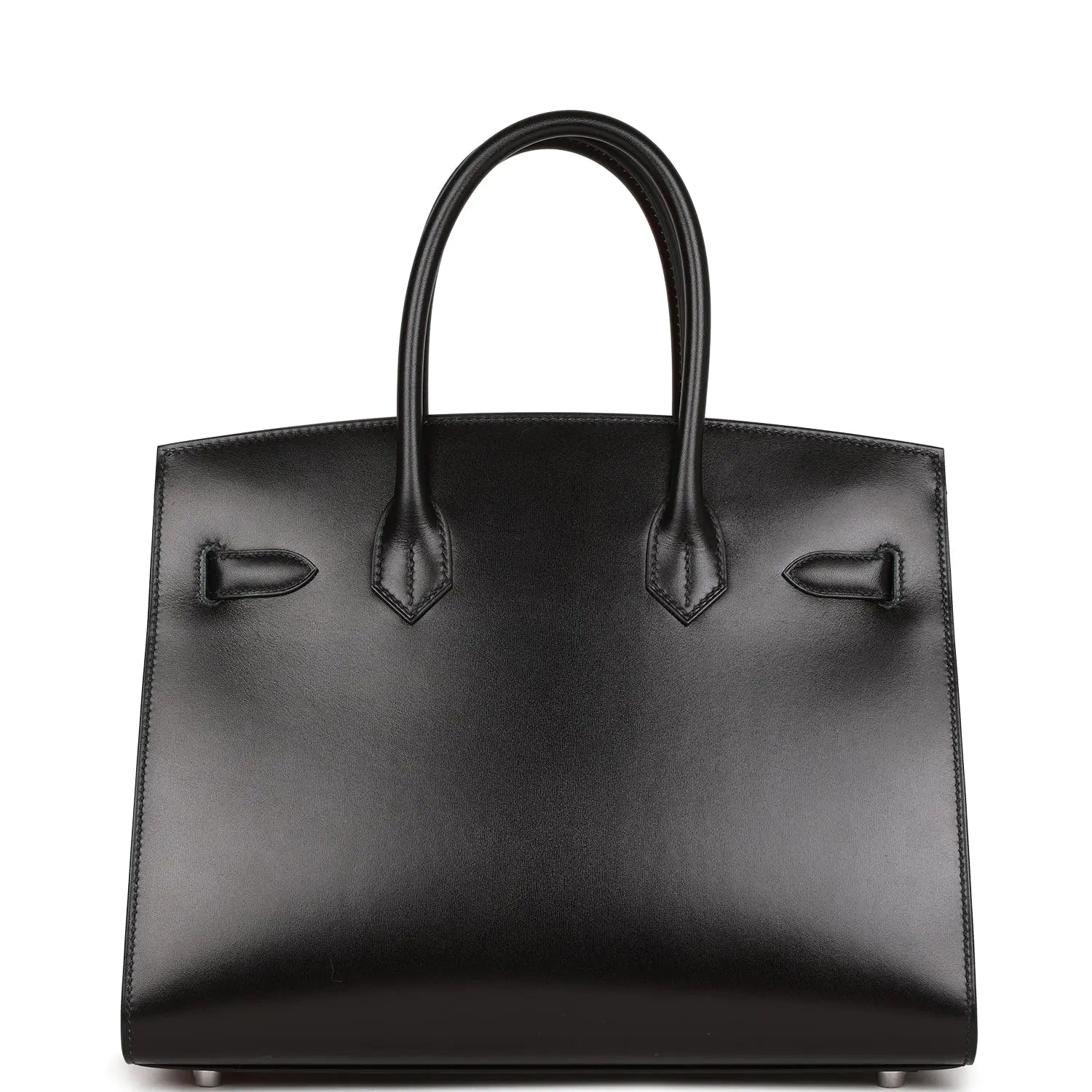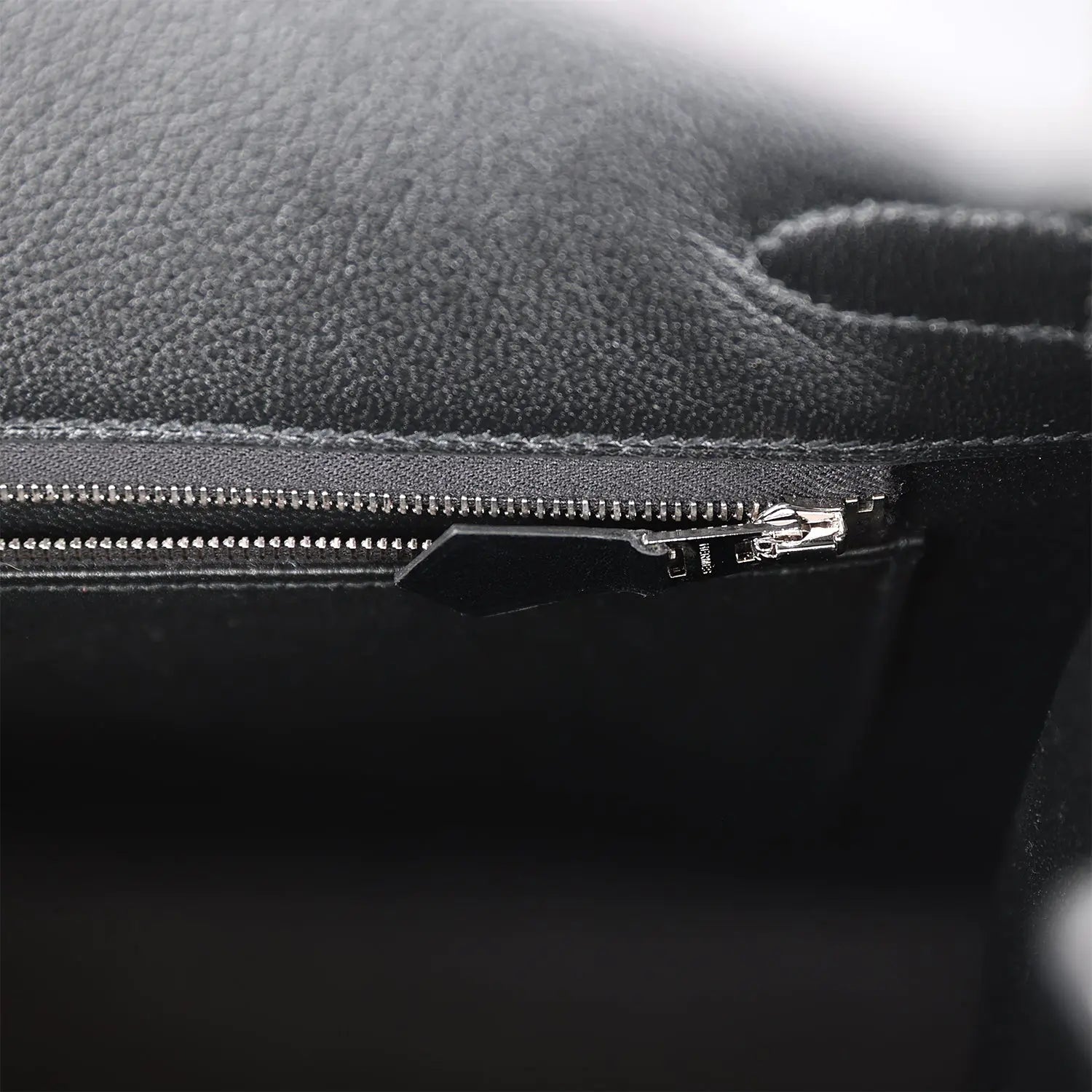 このセリエ・バーキンは、ブラックのボックスレザーにパラジウム金具をあしらったデザインで、同系色のステッチ、フロントフラップ、中央のトグル開閉式ストラップ2本、鍵2本とロック付きのクロシェット、ダブルロールハンドルが特徴です。