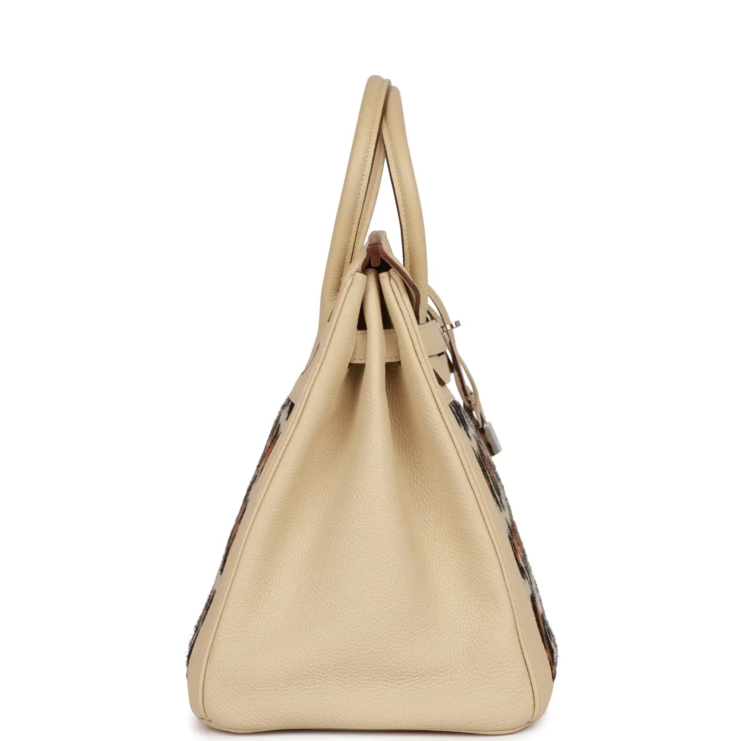 この極めて希少なバーキンは、パルシュマン・トゴレザーとレオパード柄トロイカポニーヘアを使用し、パラジウム金具をあしらっています。同系色のステッチ、フロントフラップ、中央のトグル開閉式ストラップ2本、鍵2個とロック付きクロシェット、そしてダブルロールハンドルが特徴です。