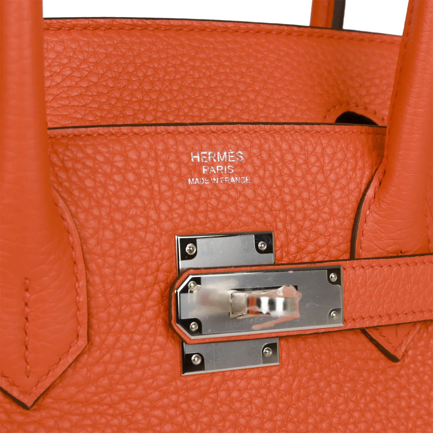 このバーキンは、オレンジポピーのクレマンスレザーにパラジウム金具が付いており、同系色のステッチ、フロントフラップ、中央のトグル留めのストラップ 2 本、ロックと鍵 2 個付きのクロシェット、ダブルロールハンドルが特徴です。