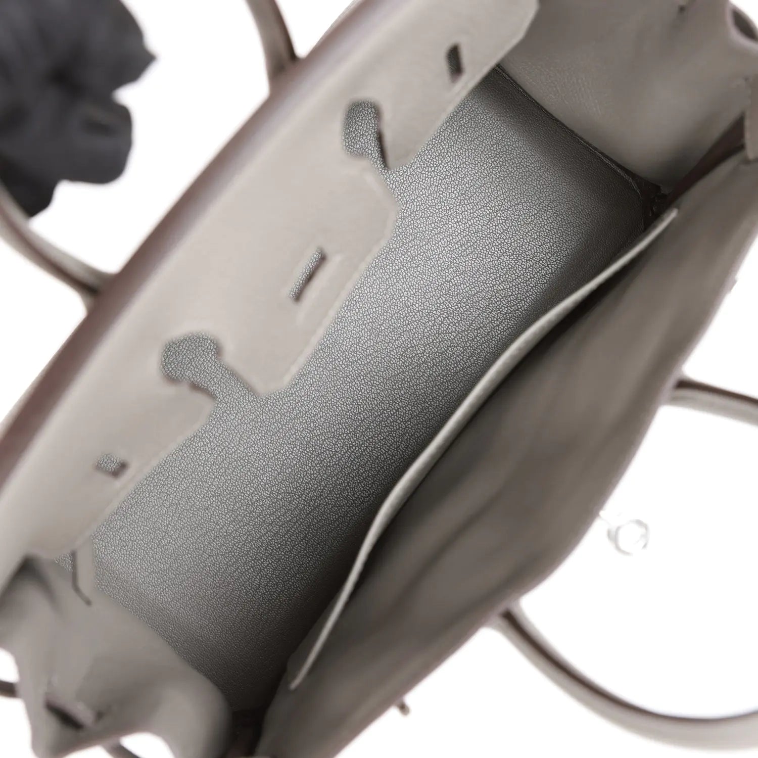 このバーキンは、グリ・マイヤーのトゴレザーにパラジウム金具をあしらったデザインで、同系色のステッチ、フロントフラップ、中央のトグル開閉式ストラップ2本、鍵2個とロック付きのクロシェット、ダブルロールハンドルが特徴です。