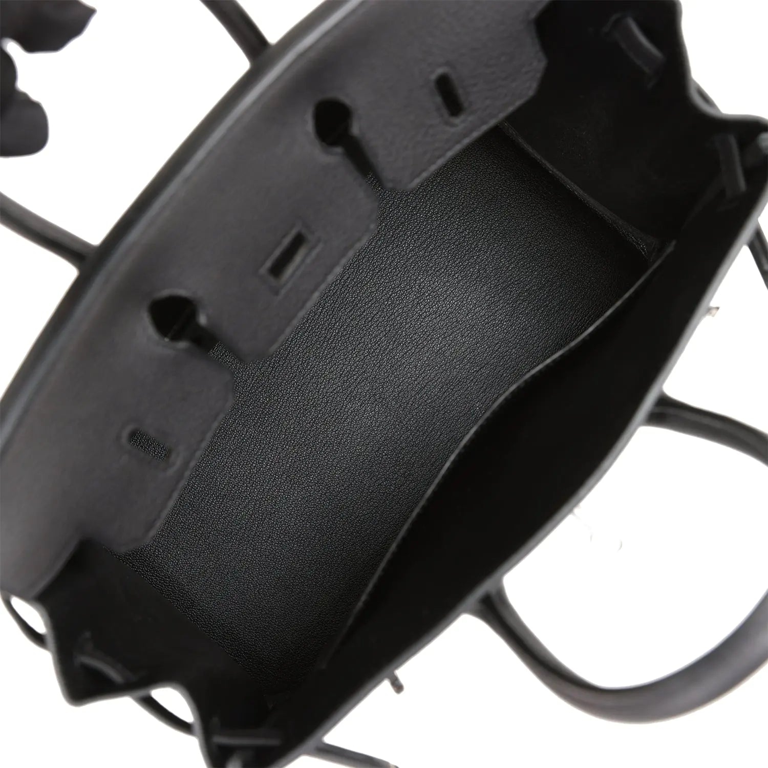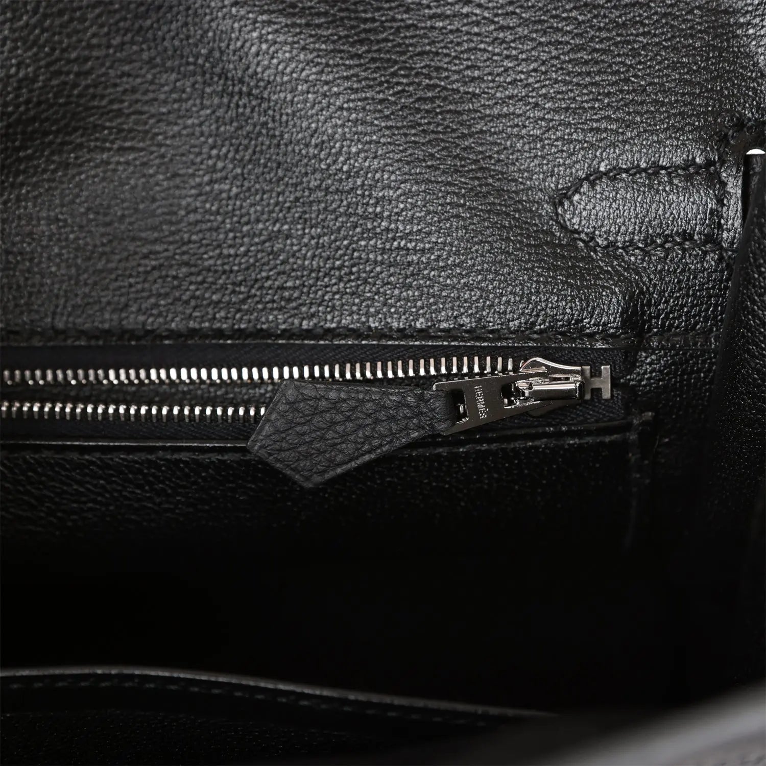 内側はブラックのシェーブルレザーで裏打ちされ、エルメスの刻印入りジッパープル付きのジップポケットと、反対側にオープンポケットが付いています。