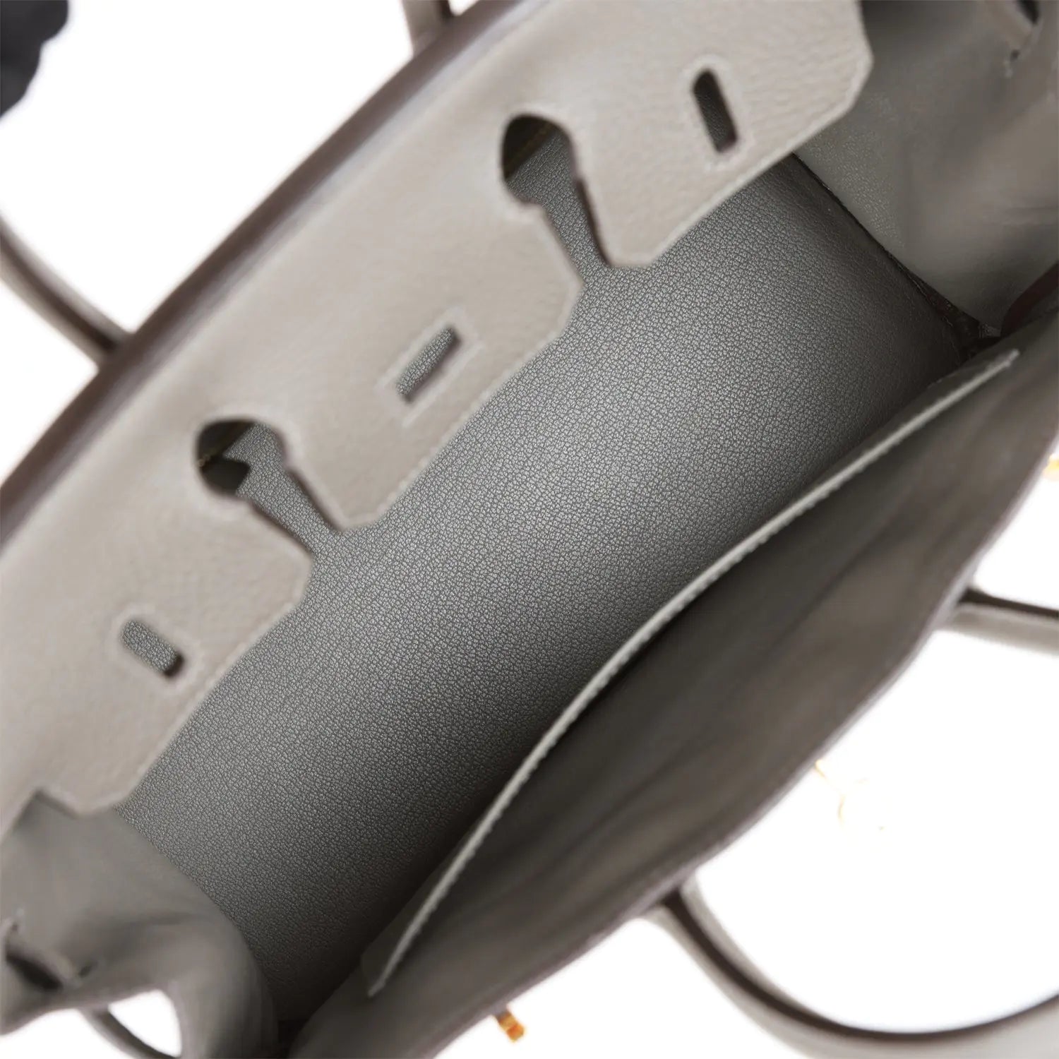 このバーキンは、グリ・メイヤーのトゴレザーにゴールドの金具をあしらったデザインで、同系色のステッチ、フロントフラップ、中央のトグル開閉式ストラップ2本、鍵2個とロック付きのクロシェット、そしてダブルロールハンドルが特徴です。