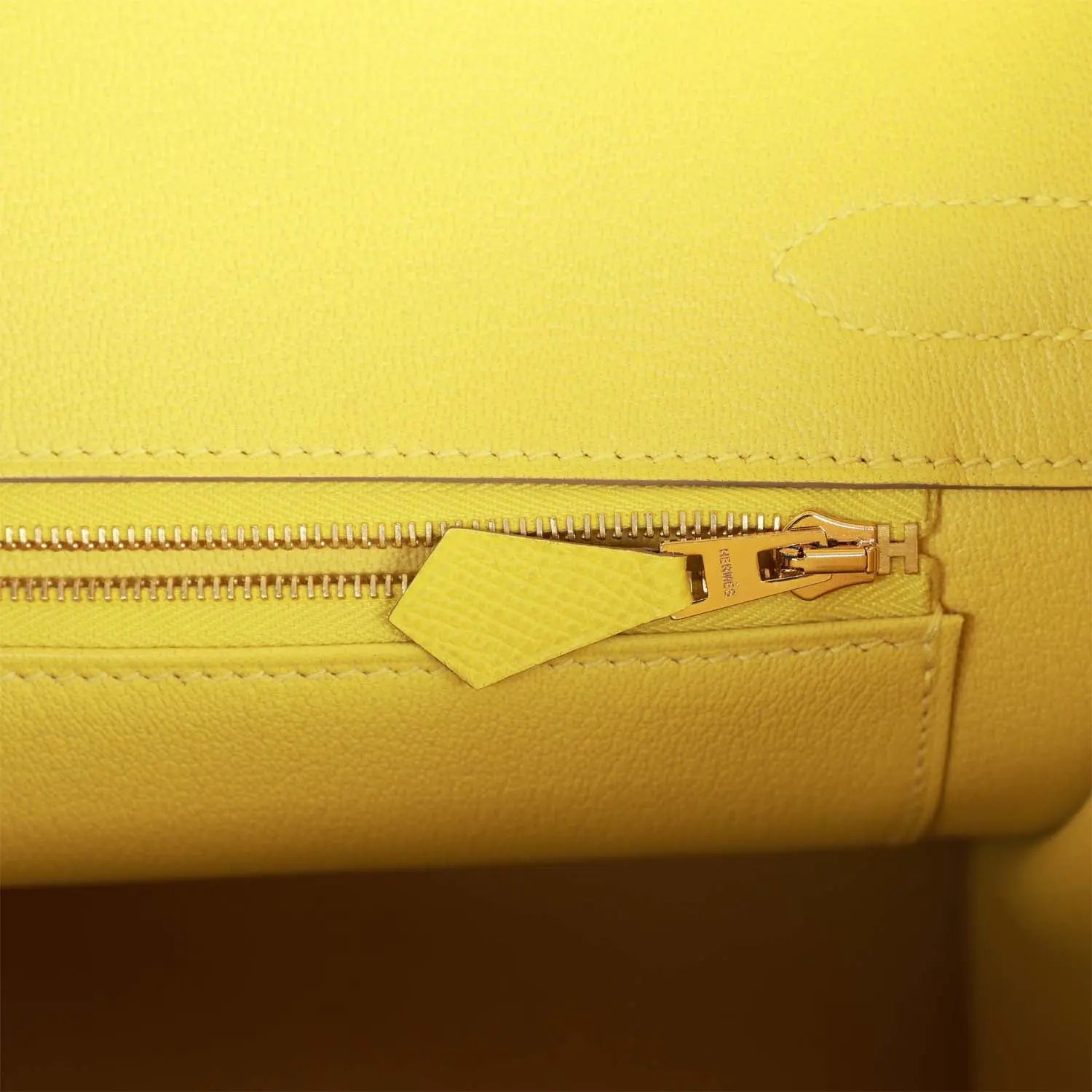 です。内側はライムカラーのシェーブルレザーで裏打ちされ、エルメスの刻印入りジッパープルが付いたジップポケットが1つと、反対側にオープンポケットが1つ付いています。