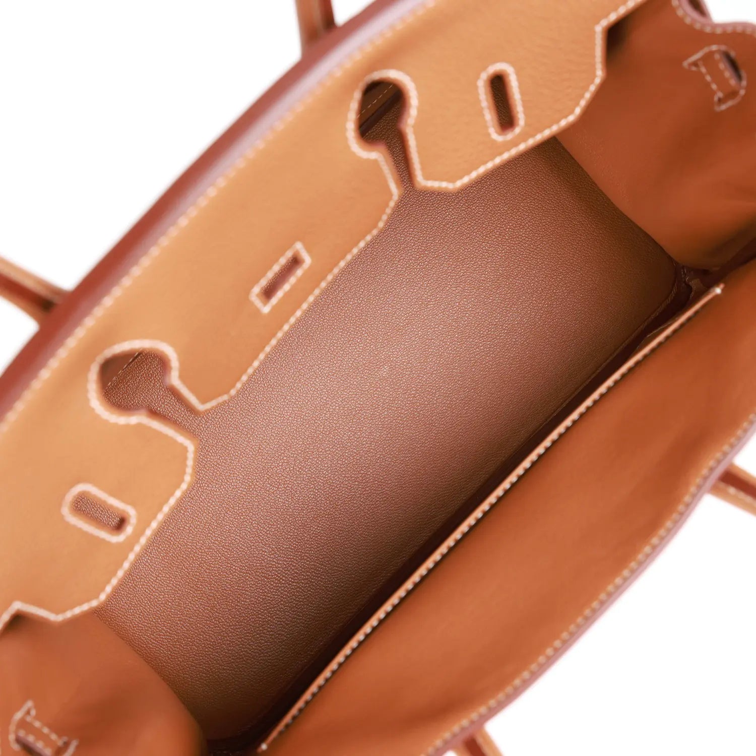 このバーキンは、ゴールドの金具が付いたゴールドのトーゴレザーで作られており、白いコントラストステッチ、フロントフラップ、中央のトグル留めの 2 本のストラップ、ロックと 2 つの鍵が付いたクロシェット、およびダブルロールハンドルが付いています。