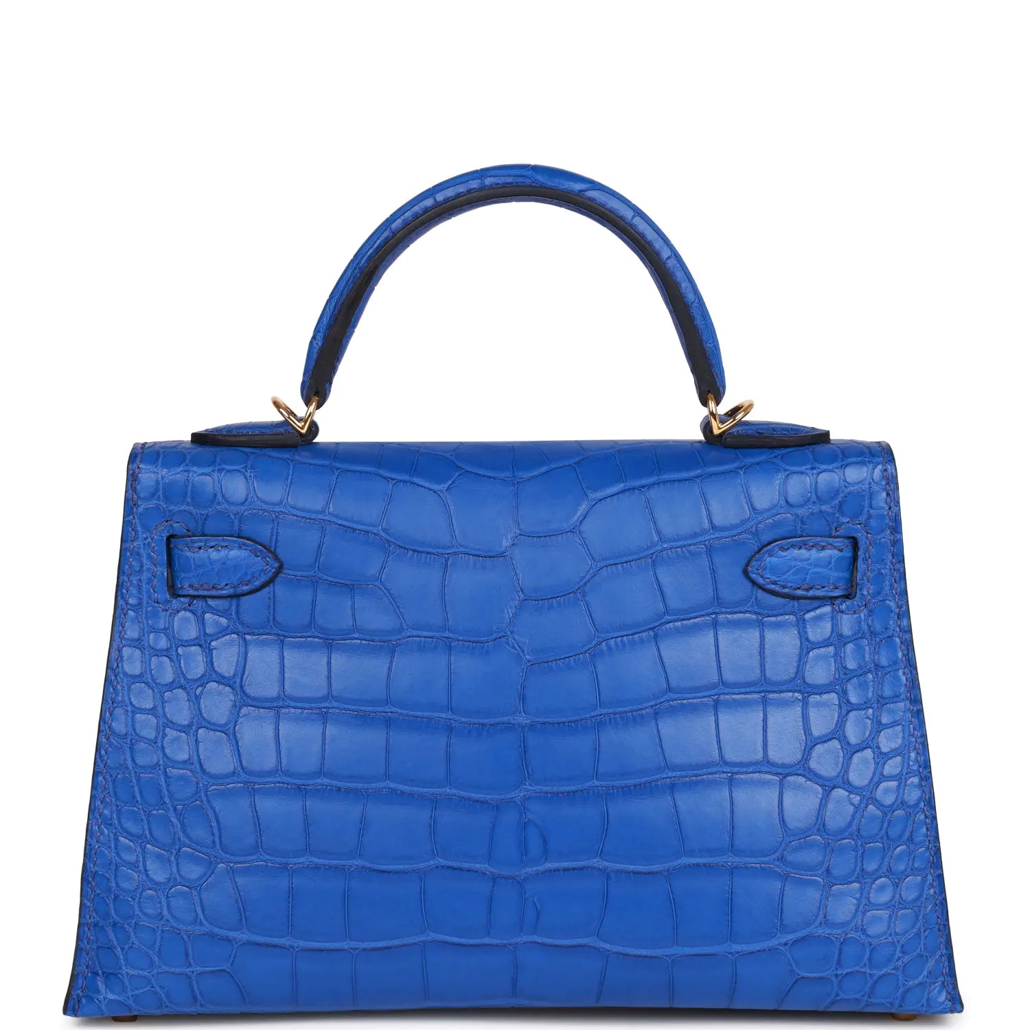 セリエスタイルのこの小さなケリーバッグは、ブルー・ロワイヤルのマットミシシッピアリゲーターレザーを使用し、ゴールドの金具と同系色のステッチが施されています。フロントトグル開閉式のフロントストラップが2本、シングルロールハンドルと取り外し可能なショルダーストラップが付いています。
