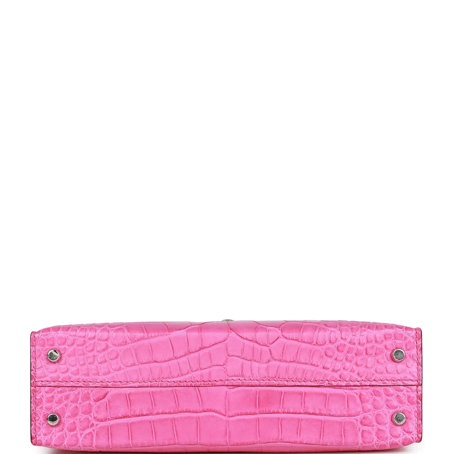 セリエスタイルのこの小さなケリーバッグは、ローズショッキングのマットミシシッピアリゲーターレザーを使用し、パラジウム金具と同系色のステッチが施されています。フロントトグル開閉式のフロントストラップが2本、シングルロールハンドルと取り外し可能なショルダーストラップが特徴です。