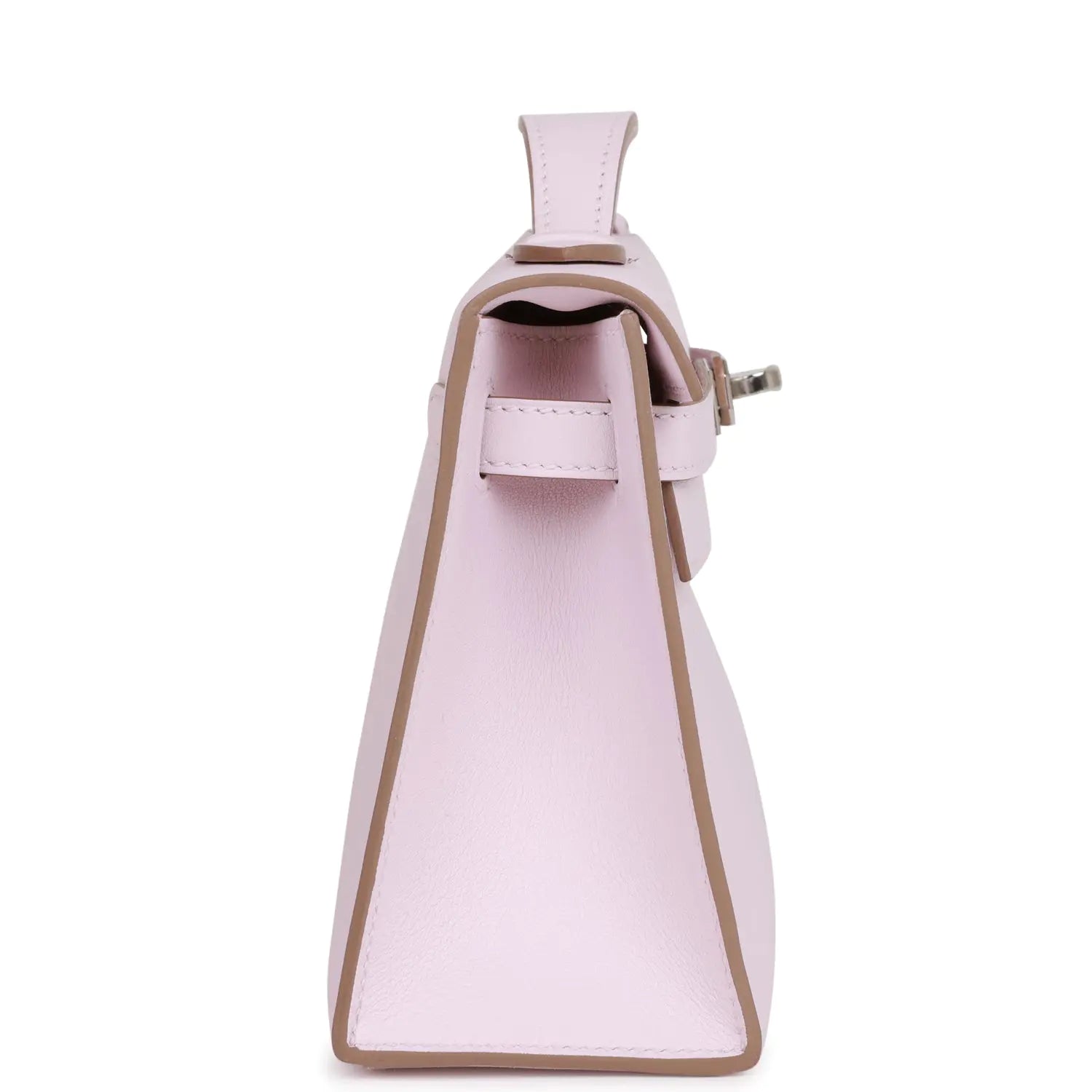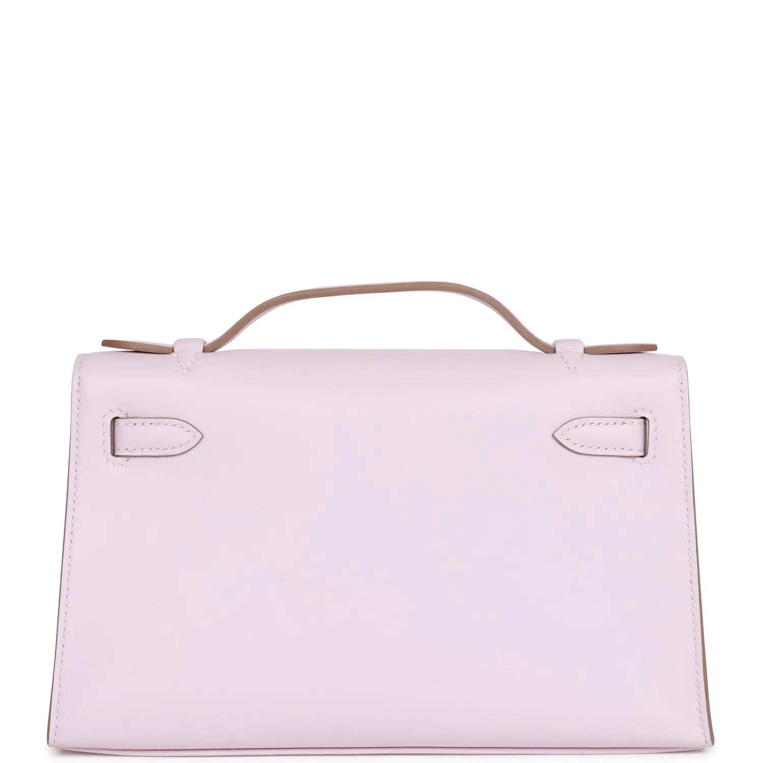 このミニ・ケリー・ポシェットは、モーヴ・ペールのスイフトレザーにパラジウム金具をあしらったデザインで、同系色のステッチ、フロントフラップ、中央のトグル開閉式ストラップ2本、トップフラットハンドルが特徴です。