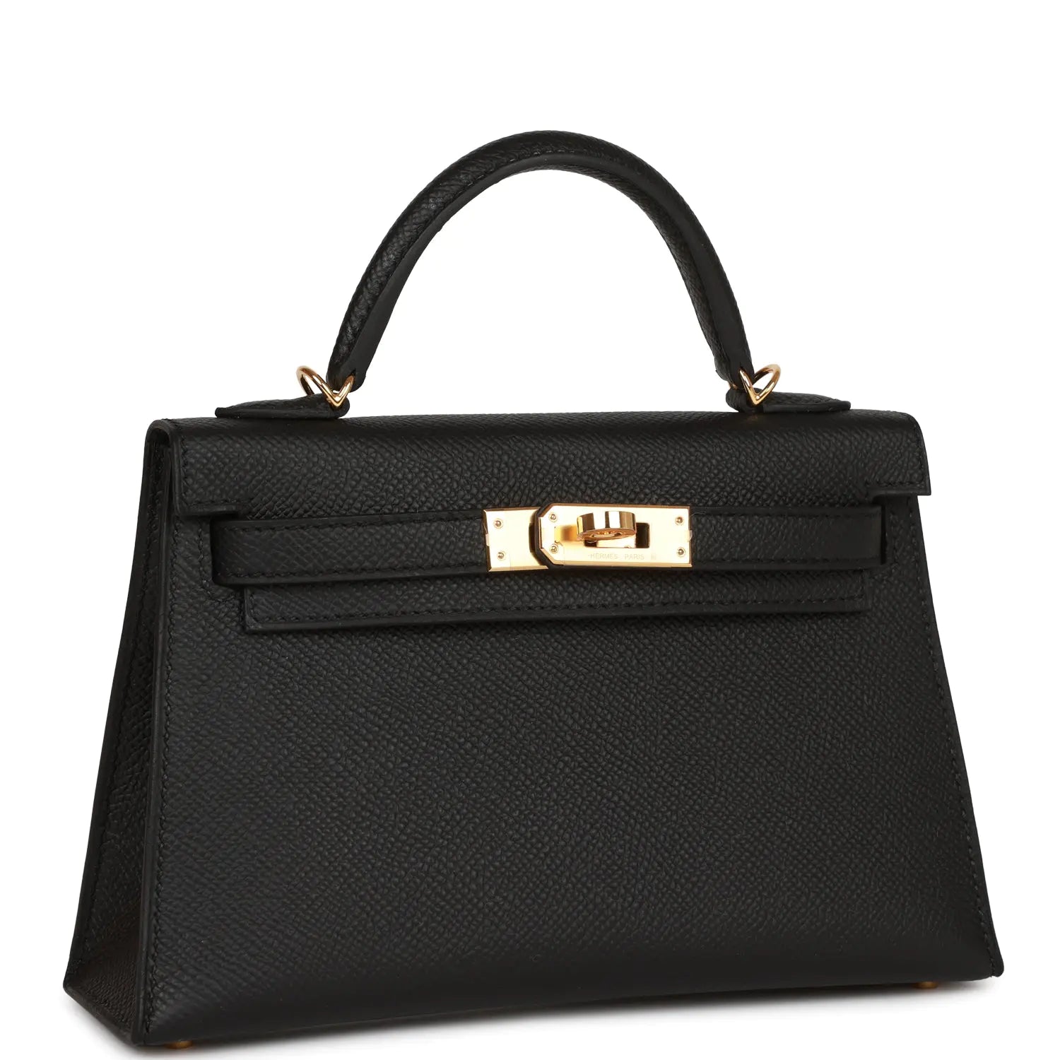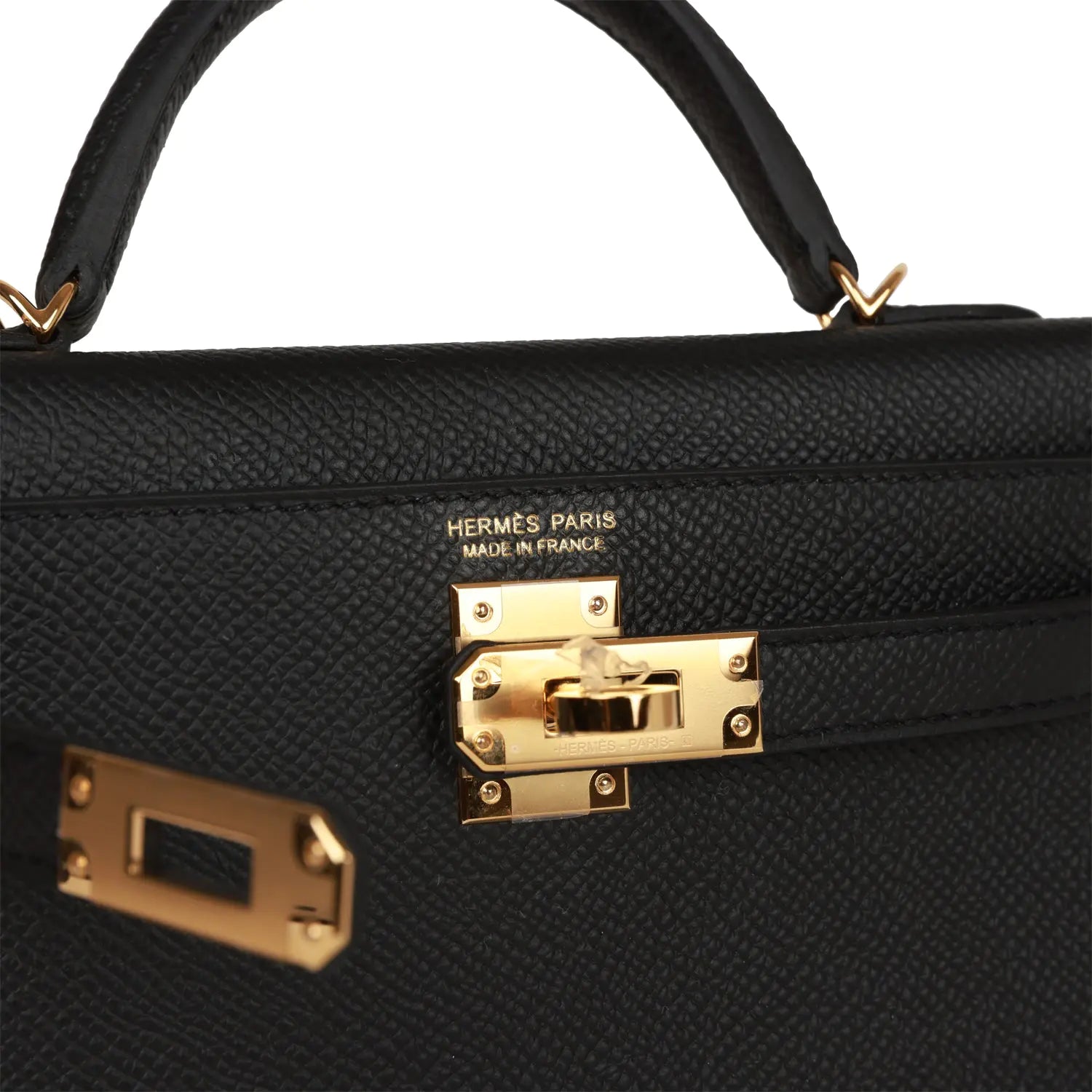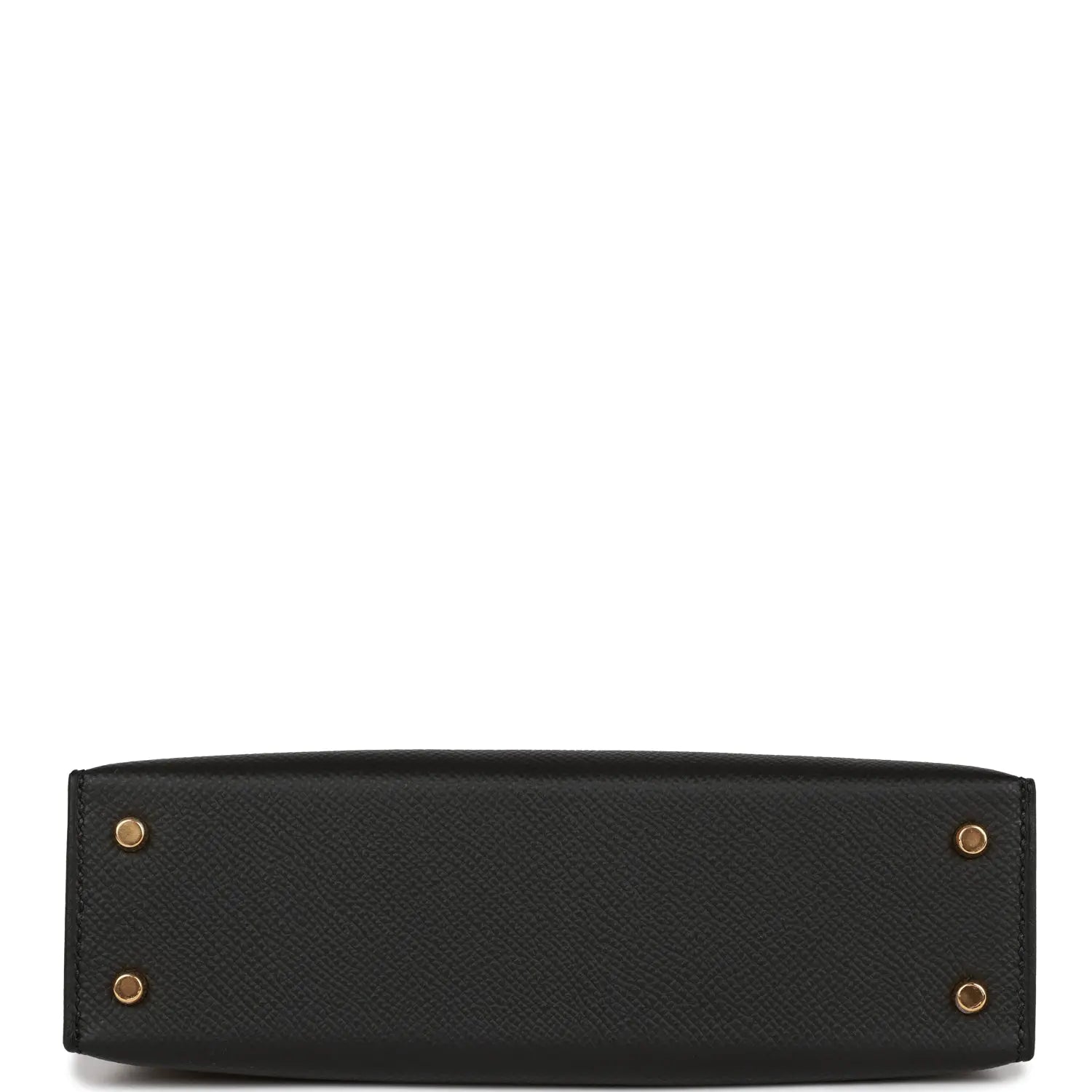 セリエスタイルのこの小さなケリーバッグは、ブラックのエプソンレザーにゴールドの金具、同系色のステッチ、フロントトグル開閉式のフロントストラップ2本、シングルロールハンドル、取り外し可能なショルダーストラップが特徴です。