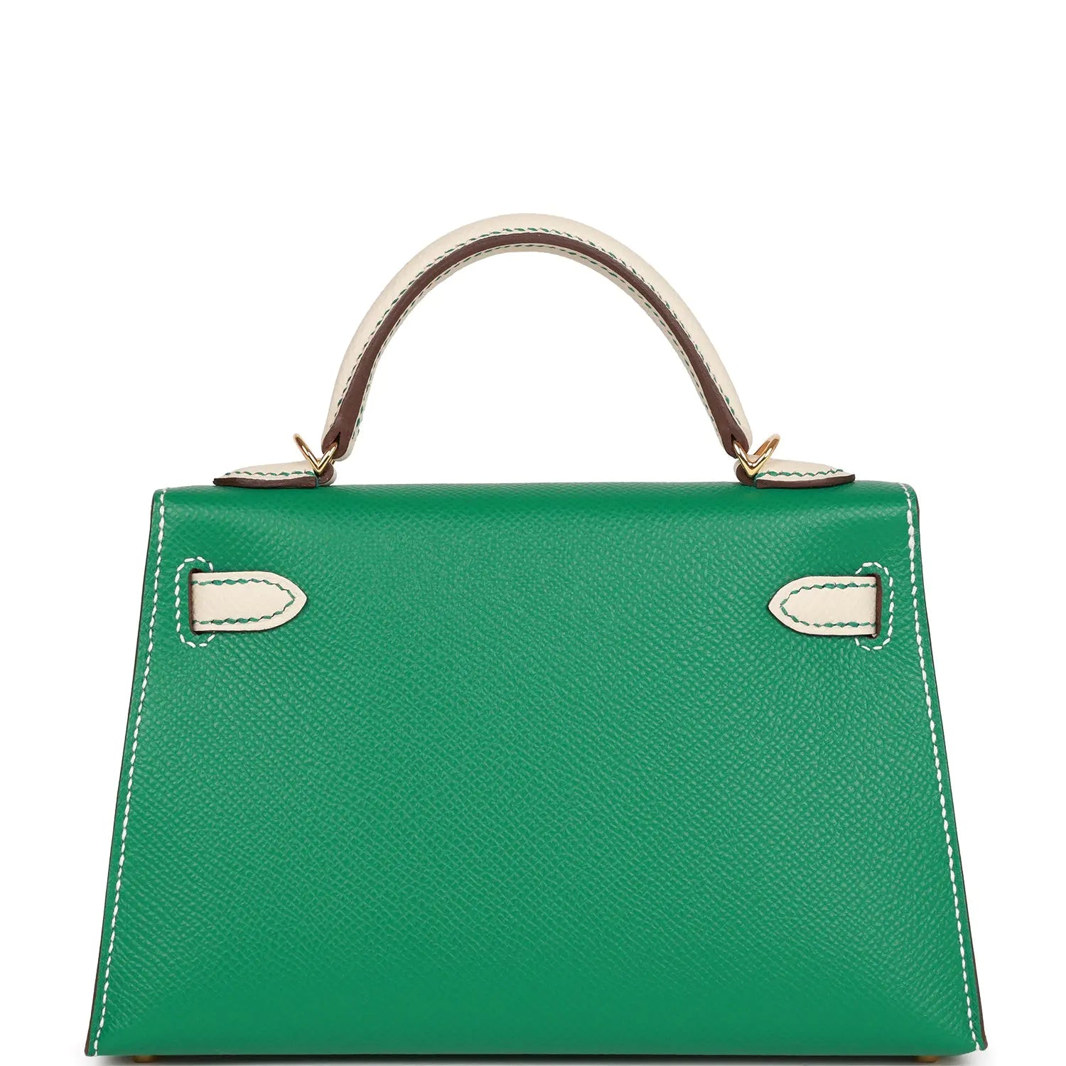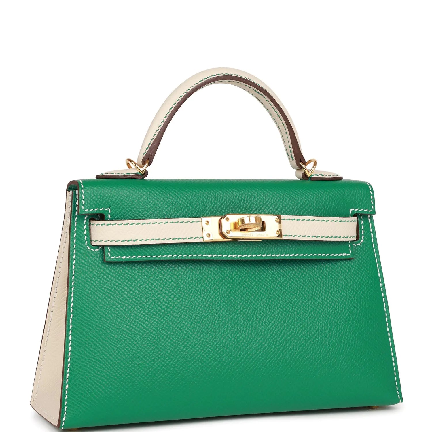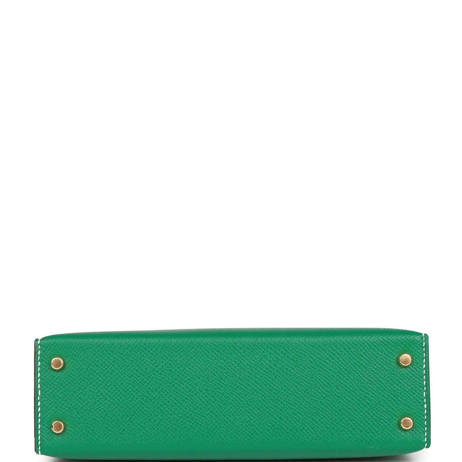 セリエスタイルのこの小さなホースシュー・スタンプ・ケリーは、ヴェール・ジェイドとクレ・エプソンレザーにゴールドの金具、コントラストステッチ、フロントトグル開閉のフロントストラップ2本、シングルロールハンドル、取り外し可能なショルダーストラップが特徴です。