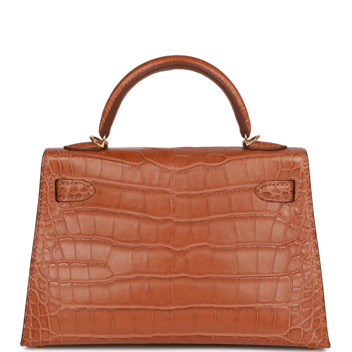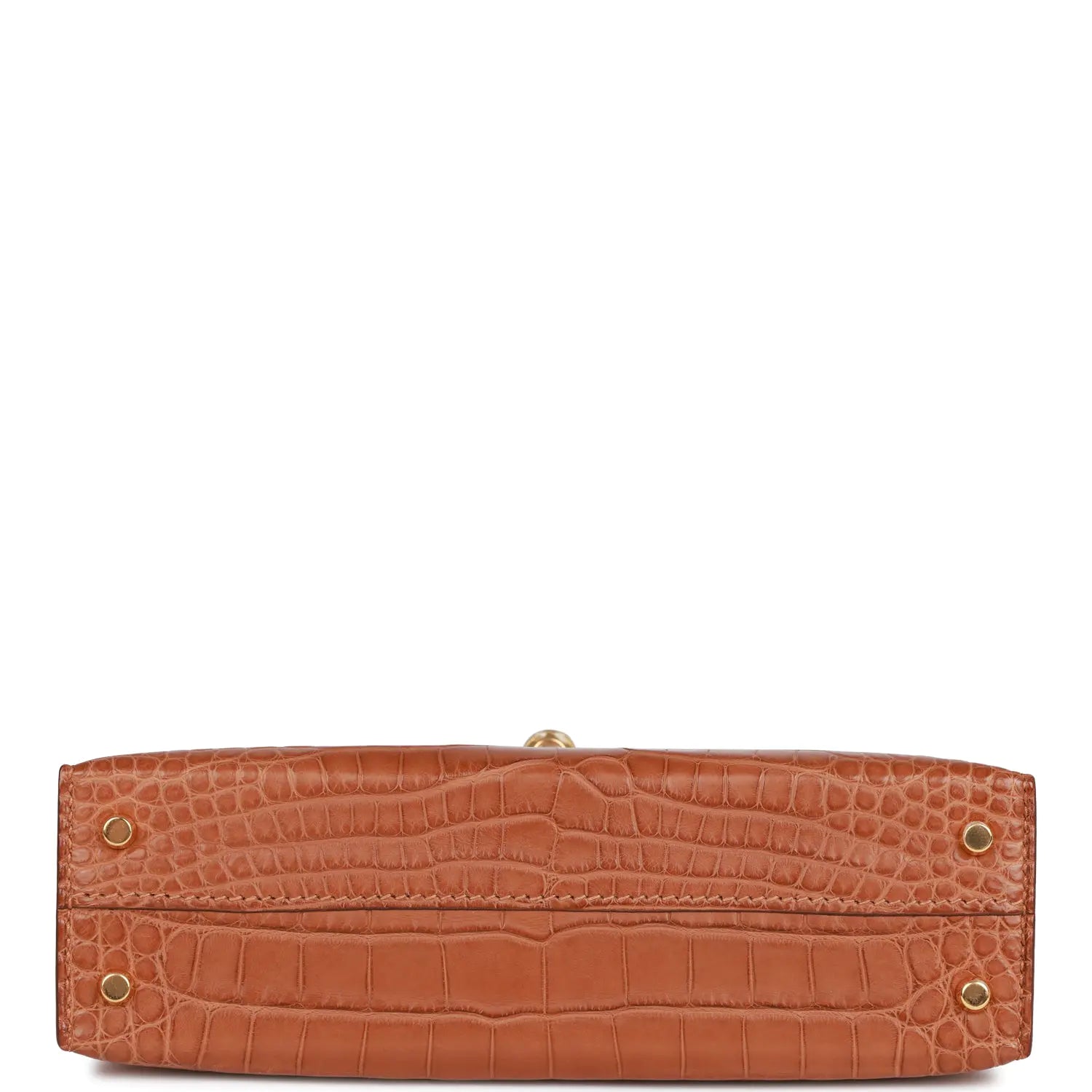 セリエスタイルのこの小さなケリーバッグは、ゴールドのマットミシシッピアリゲーターレザーにゴールドの金具、同系色のステッチ、フロントトグル開閉のフロントストラップ2本、シングルロールハンドル、取り外し可能なショルダーストラップが特徴です。