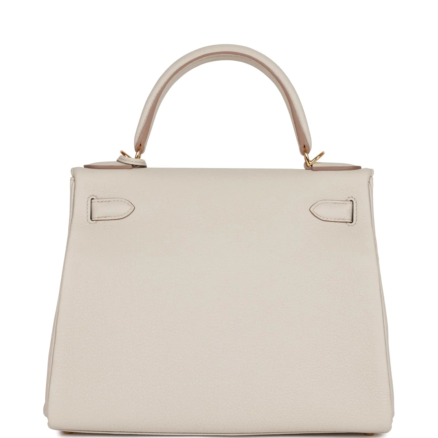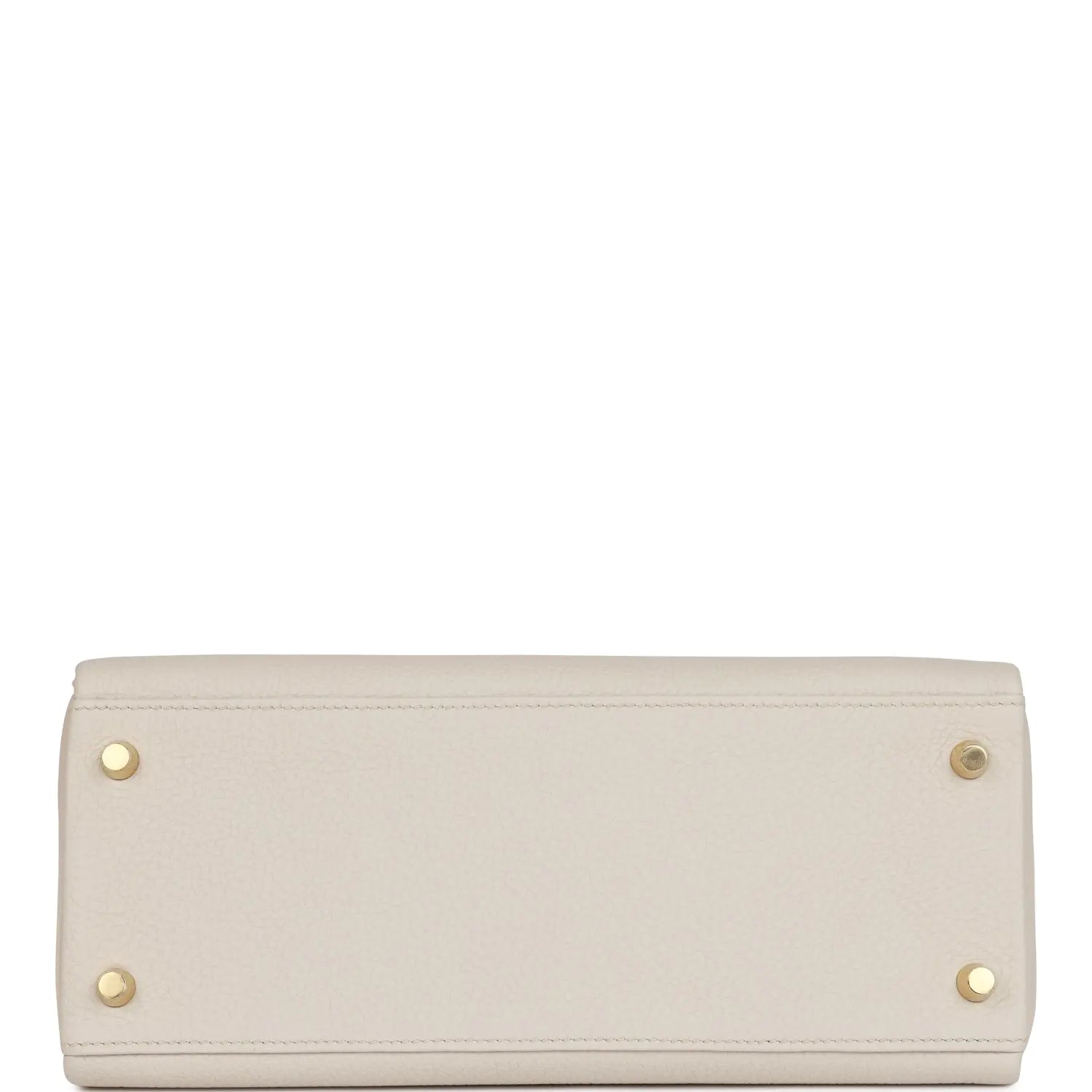このルトゥールヌ スタイルのケリーは、ゴールドの金具が付いたベトン トーゴ レザーでできており、同系色のステッチ、フロント フラップ、中央のトグル留めの 2 本のストラップ、ロックと 2 つの鍵が付いたクロシェット、シングル ロール ハンドル、取り外し可能なショルダー ストラップが付いています。