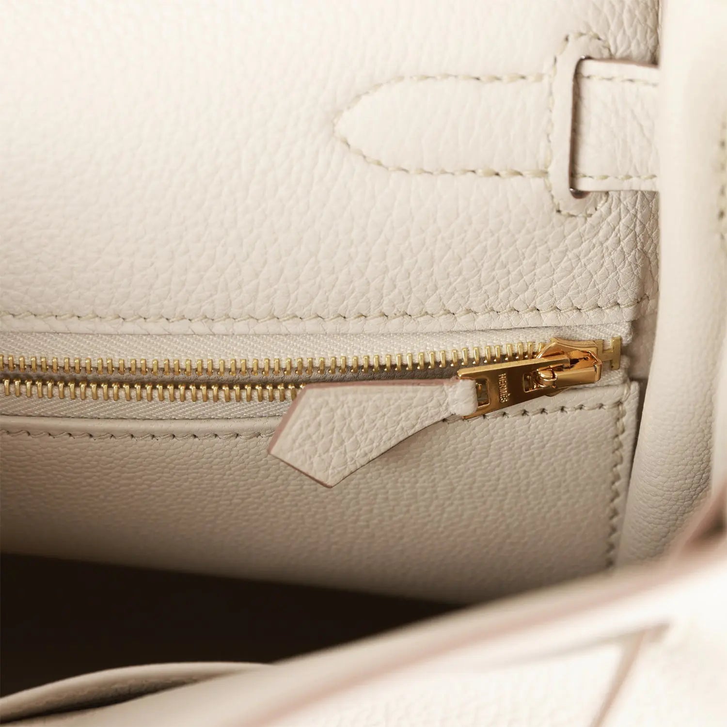 内側はベトンシェーブルのライニングが施され、エルメスの刻印入りプル付きのジップポケットが1つ、反対側にオープンポケットが2つ付いています。