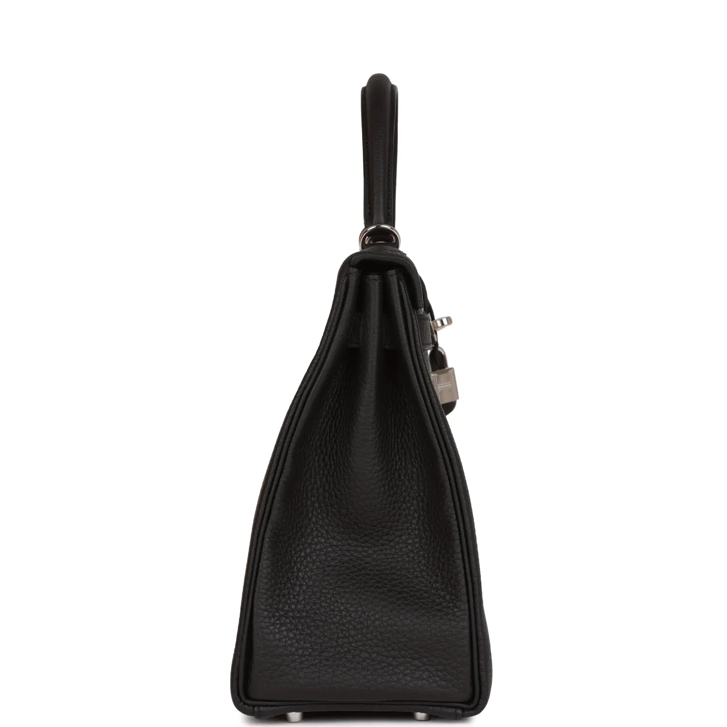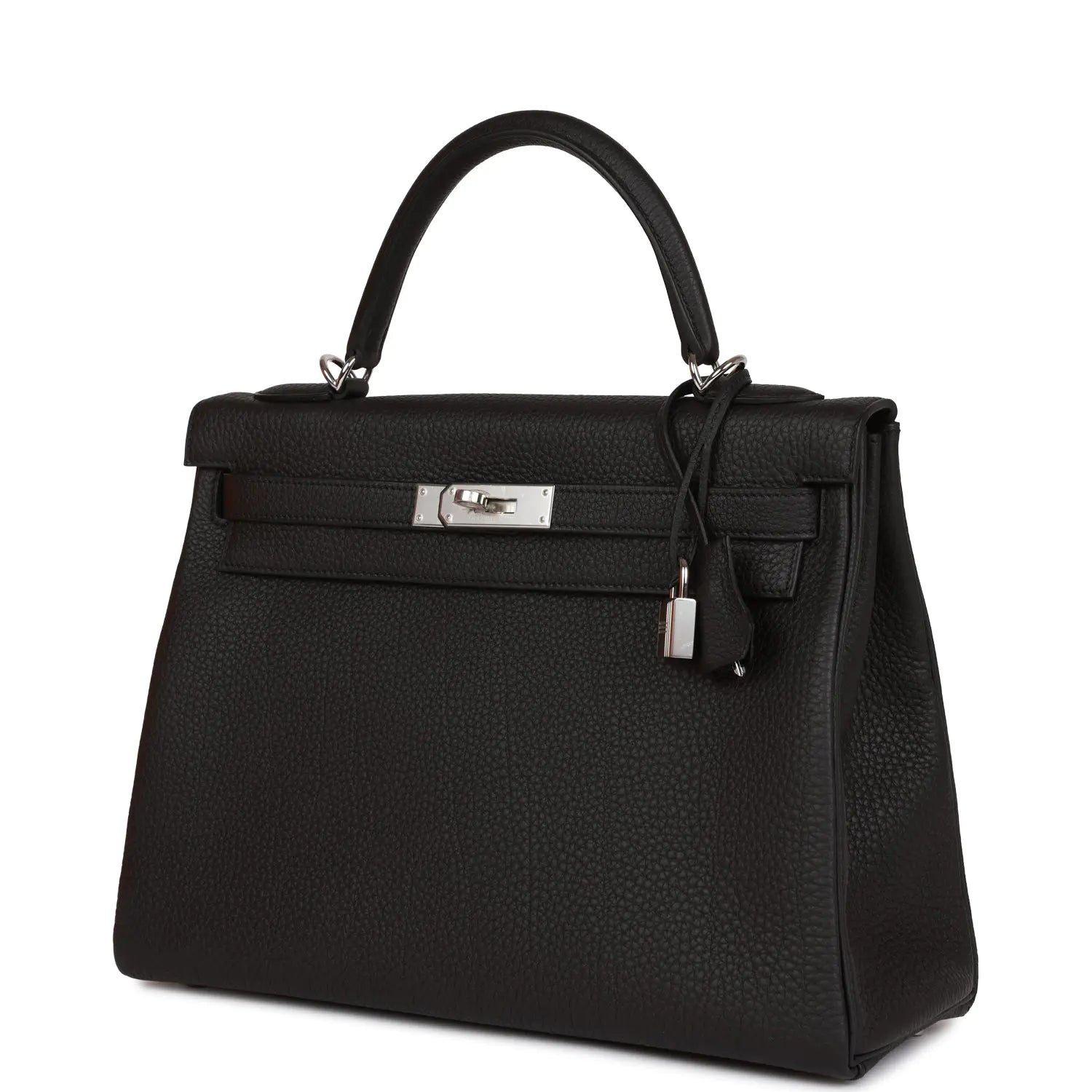 ルトゥールヌスタイルのこのケリーバッグは、ブラックのトゴレザーにパラジウム金具、同系色のステッチ、フロントトグル開閉の2本のストラップ、鍵と2本の鍵が付いたクロシェット、シングルロールハンドル、そしてオプションのショルダーストラップが特徴です。