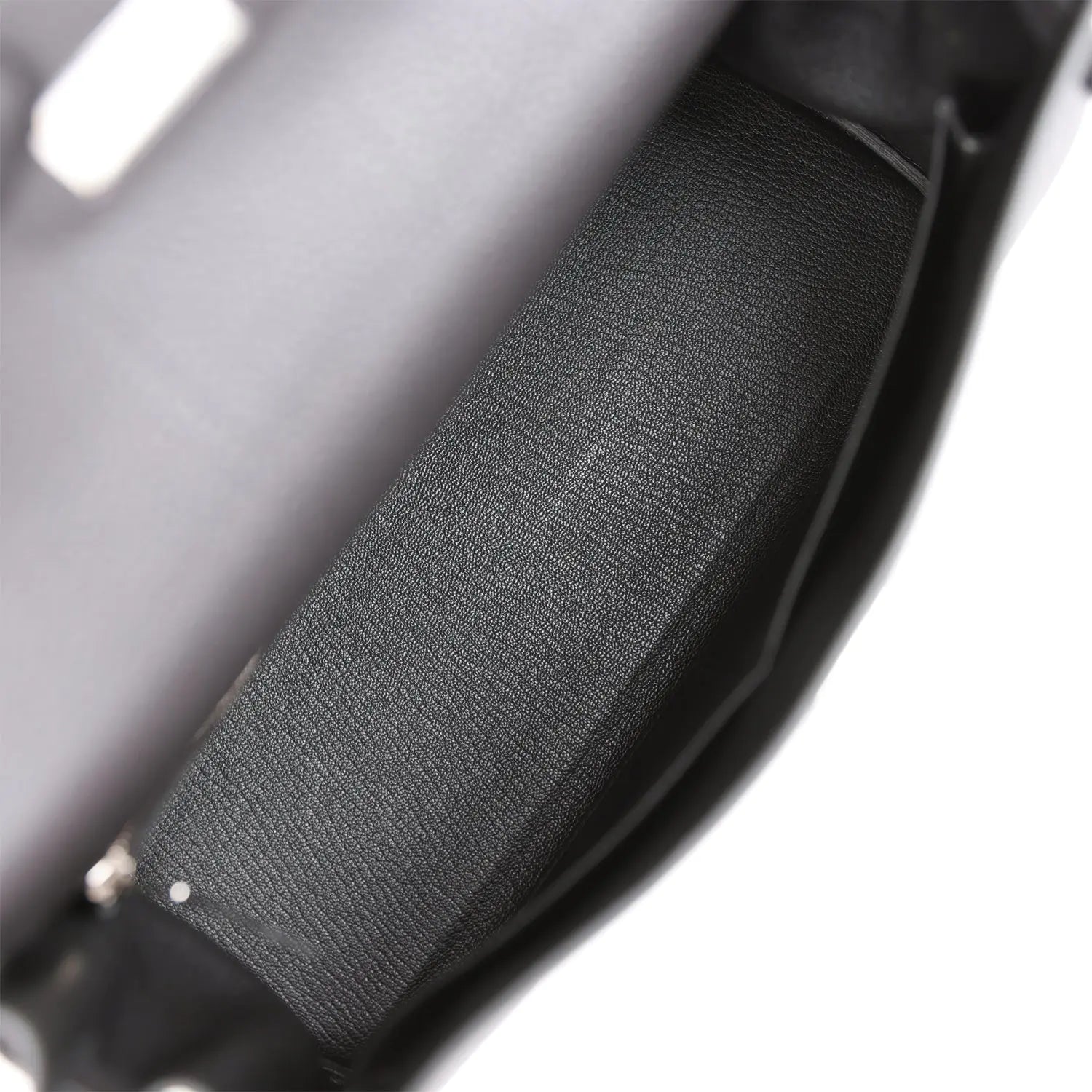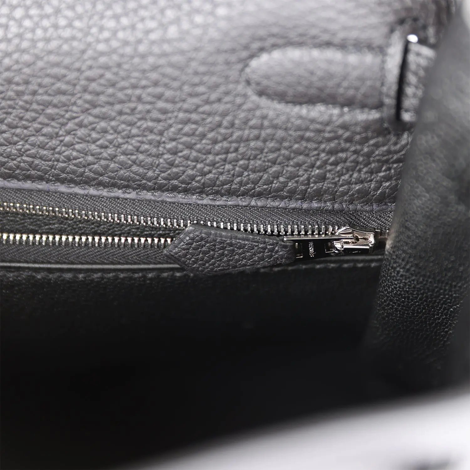 内側はブラックのシェーブルレザーのライニングが施され、エルメスの刻印入りプル付きのジッパー付きポケットが1つ、反対側にオープンポケットが2つ付いています。