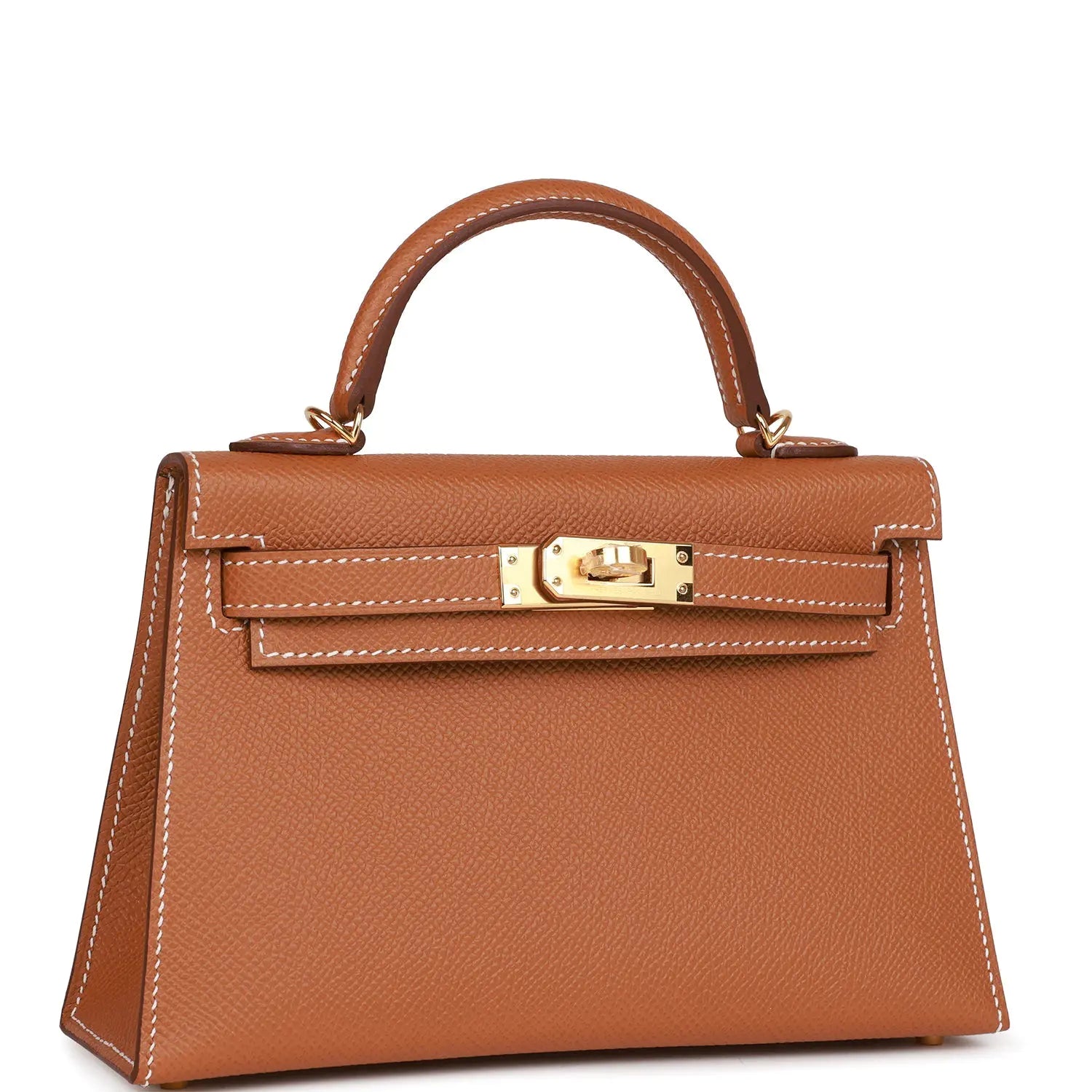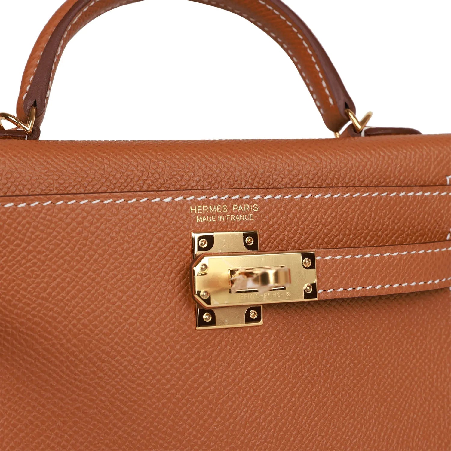 セリエスタイルのこの小さなケリーバッグは、ゴールドのエプソムレザーにゴールドの金具、コントラストステッチ、フロントトグル開閉のフロントストラップ2本、シングルロールハンドル、取り外し可能なショルダーストラップが特徴です。