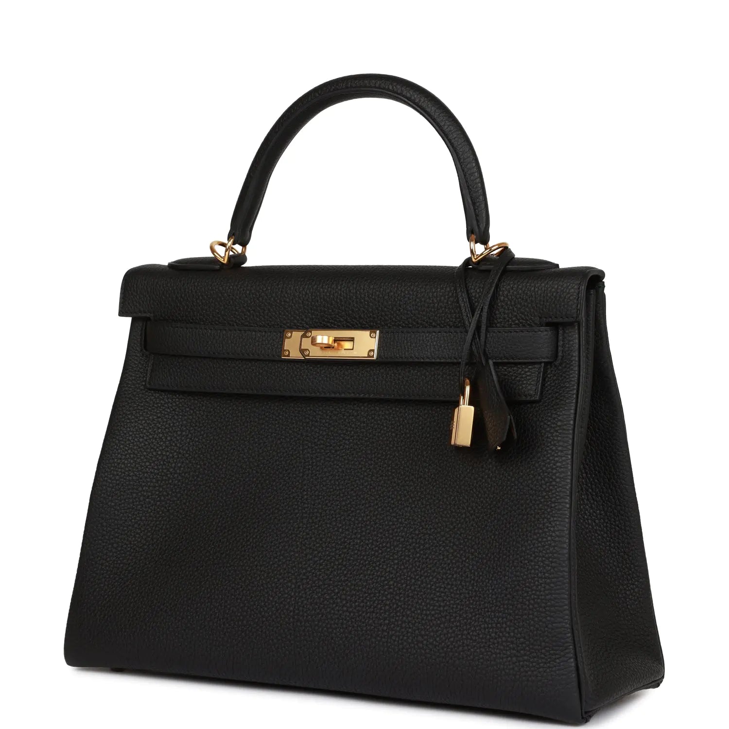 ルトゥールヌスタイルのこのケリーバッグは、ブラックのトゴレザーにゴールドの金具、同系色のステッチ、フロントトグル開閉の2本のストラップ、鍵と鍵2本付きのクロシェット、シングルロールハンドル、取り外し可能なショルダーストラップが特徴です。