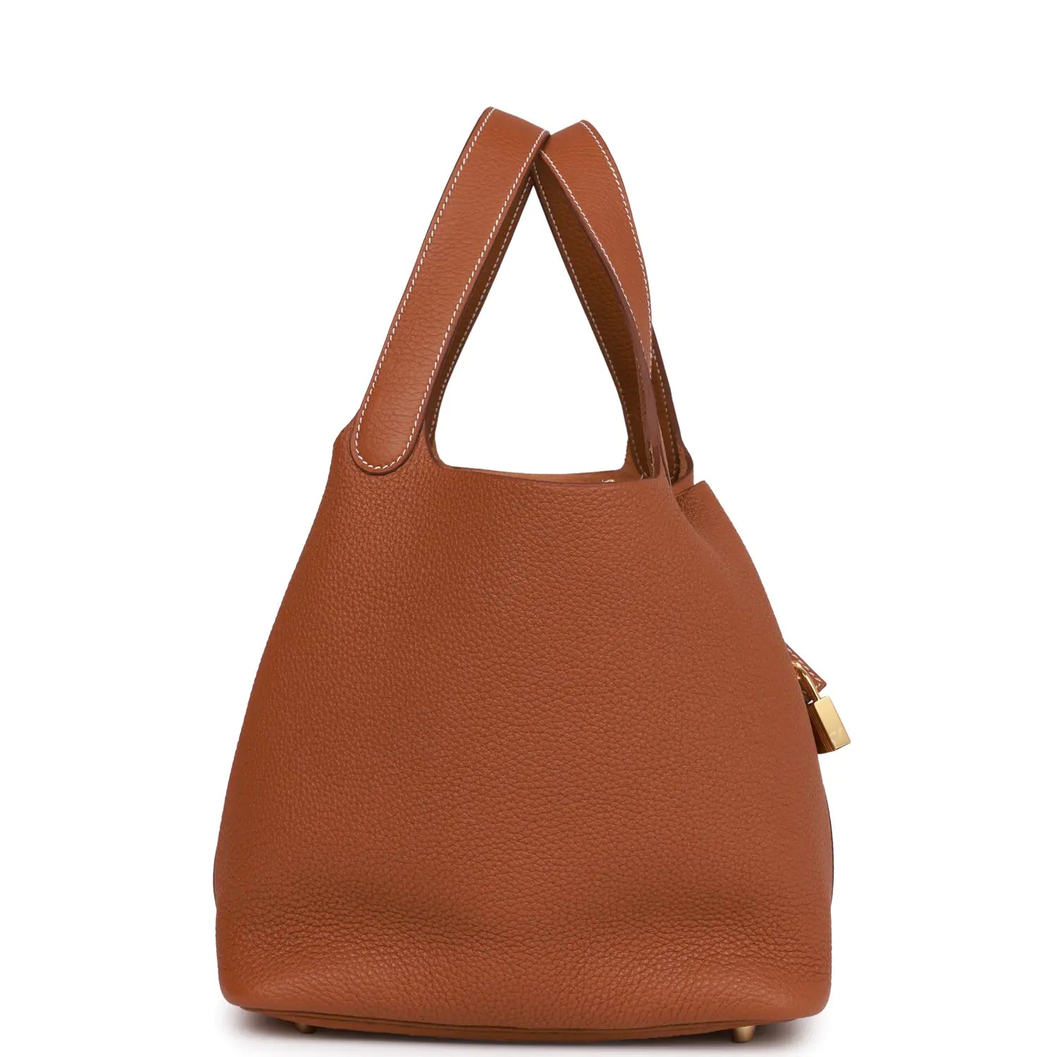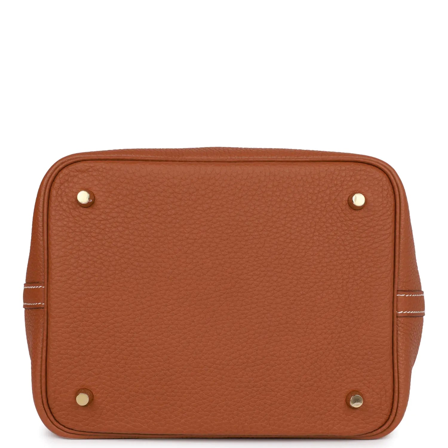 このピコタンはゴールドのクレマンス レザーにゴールドの金具が付いており、2 つのトップ ハンドルにコントラストのステッチが施されています。
