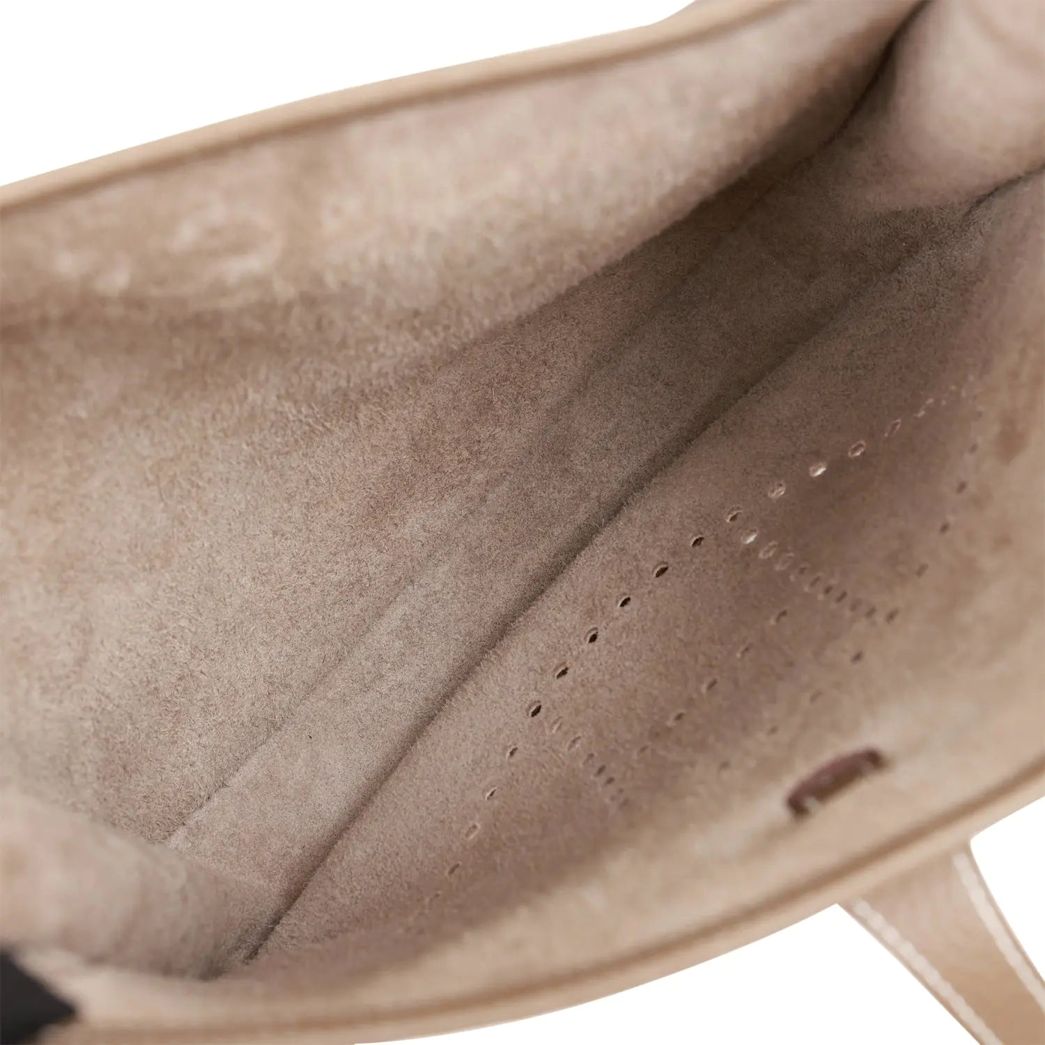 このEvelyneは、パラジウムの金具が付いたエトゥープクレマンスレザーを使用しており、コントラストステッチ、プルタブトップクロージャー、取り外し可能なエトゥープキャンバスとレザーのショルダー/クロスボディストラップが付いています。
