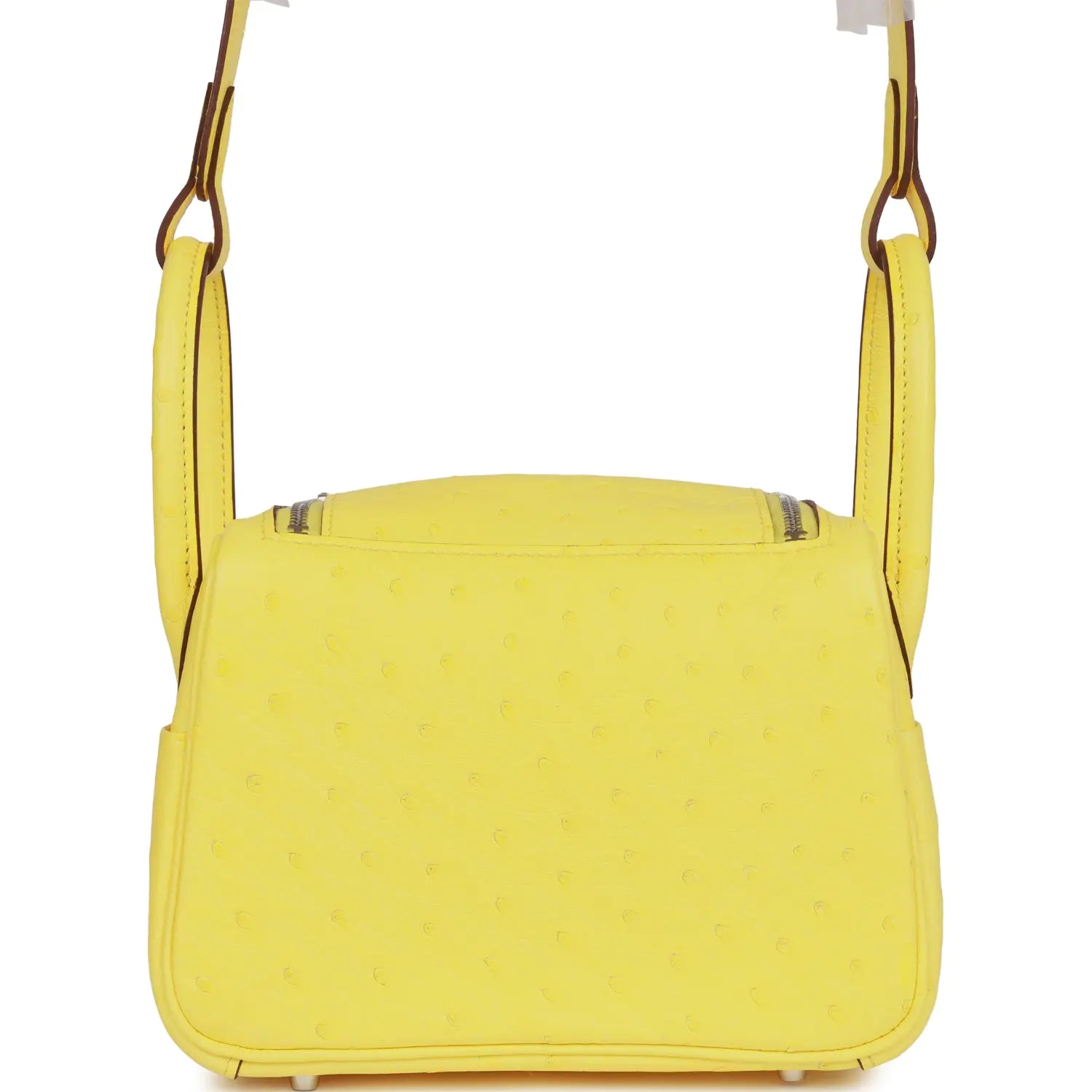 このミニ リンディは、ジョーヌ シトロンのオーストリッチ レザーにパラジウム ハードウェアが使用され、同系色のステッチ、ダブル ジッパー プル、フロントのエルメス ツイスト ロック、両側に 1 つのポケット、フラットなショルダー ストラップでつながれた 2 つのロールトップ ハンドルが付いています。