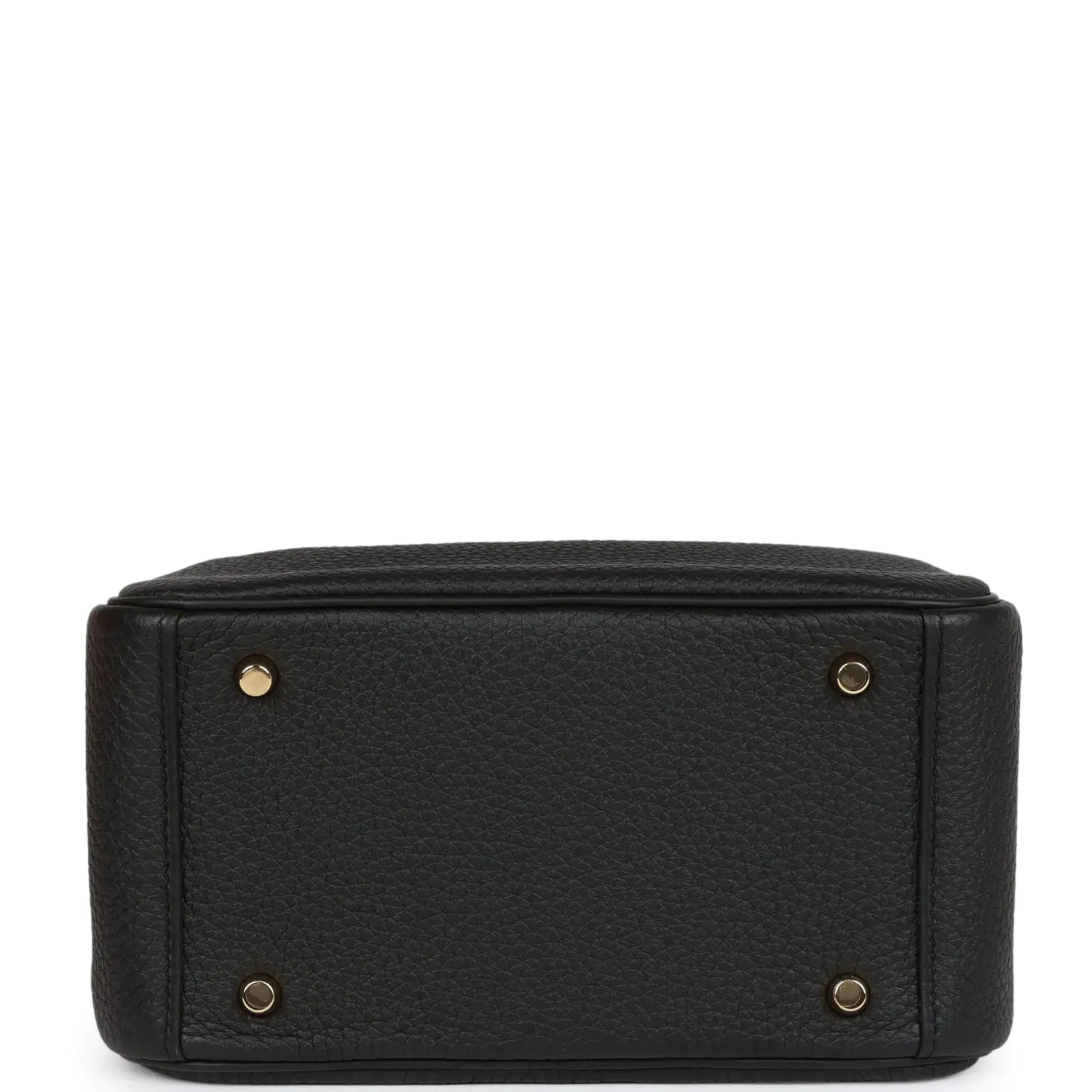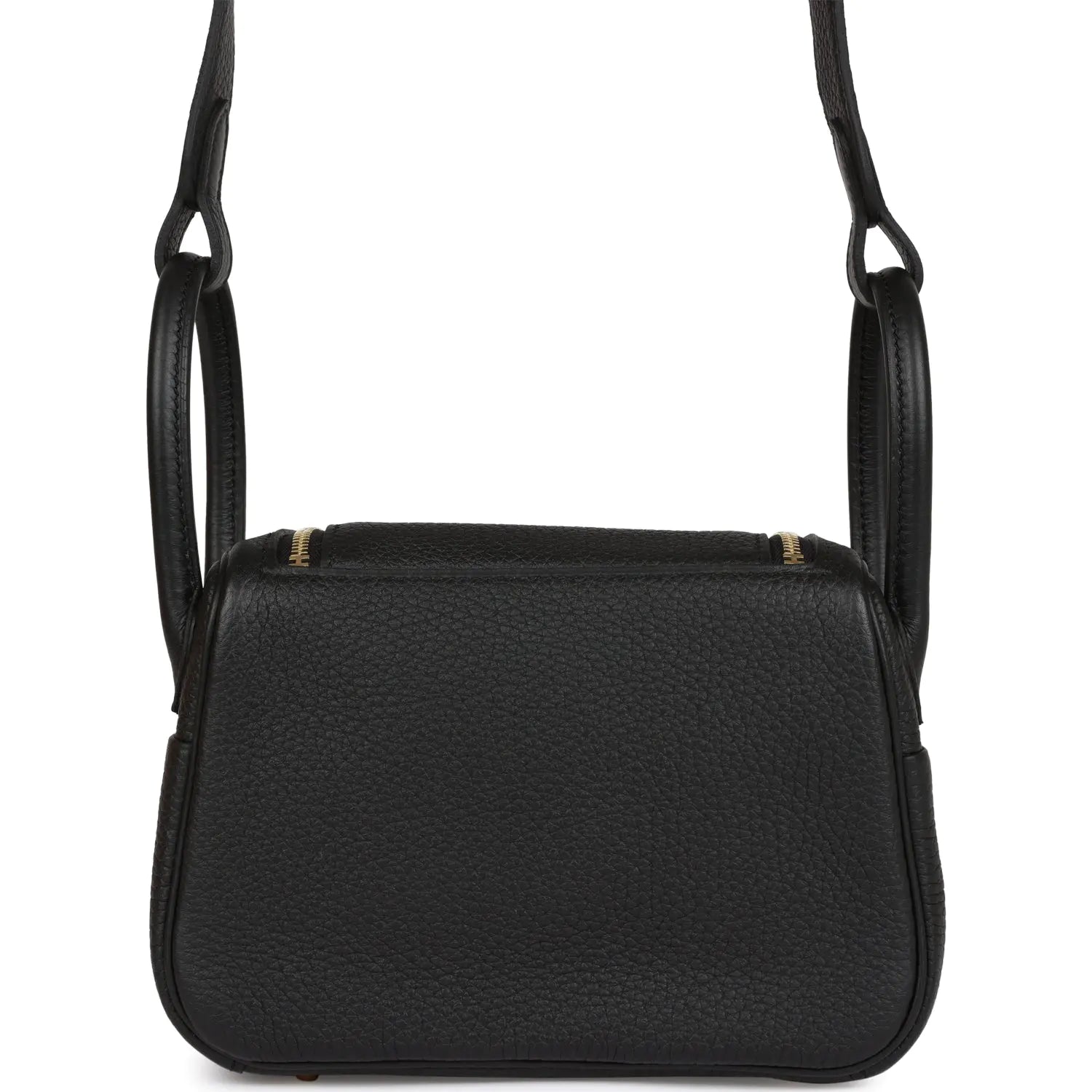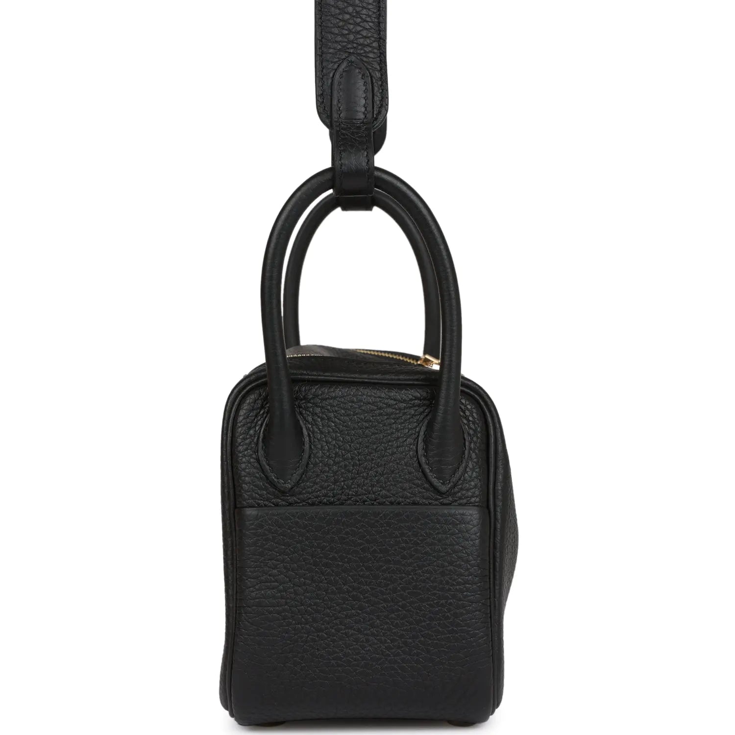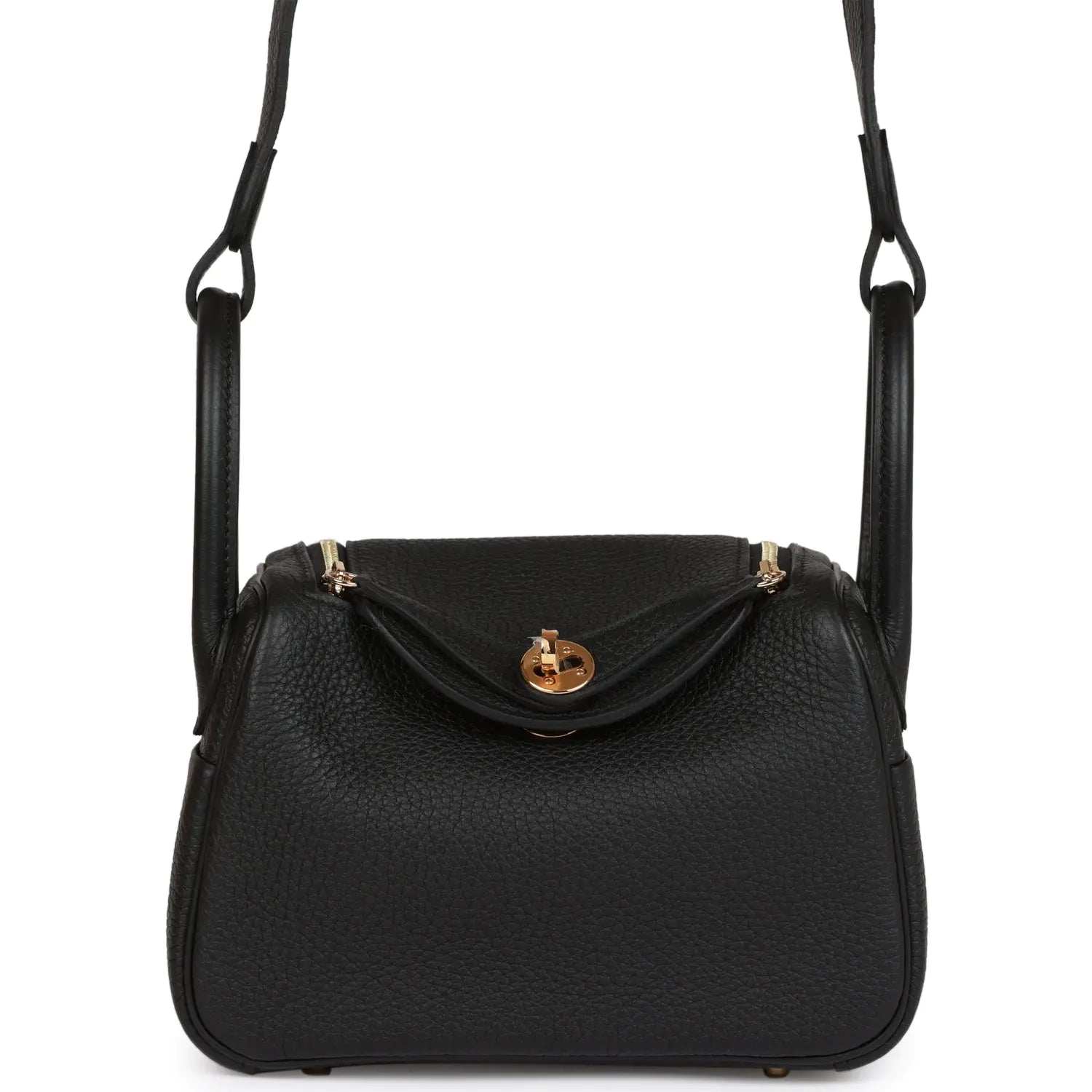 このミニ リンディは、ブラックのクレマンスレザーにゴールドの金具をあしらったデザインで、同系色のステッチ、ダブルジッパーのプル、フロントのエルメスツイストロック、両サイドにポケットが1つずつ、フラットなショルダーストラップで繋がれたロールトップハンドルが2つ付いています。