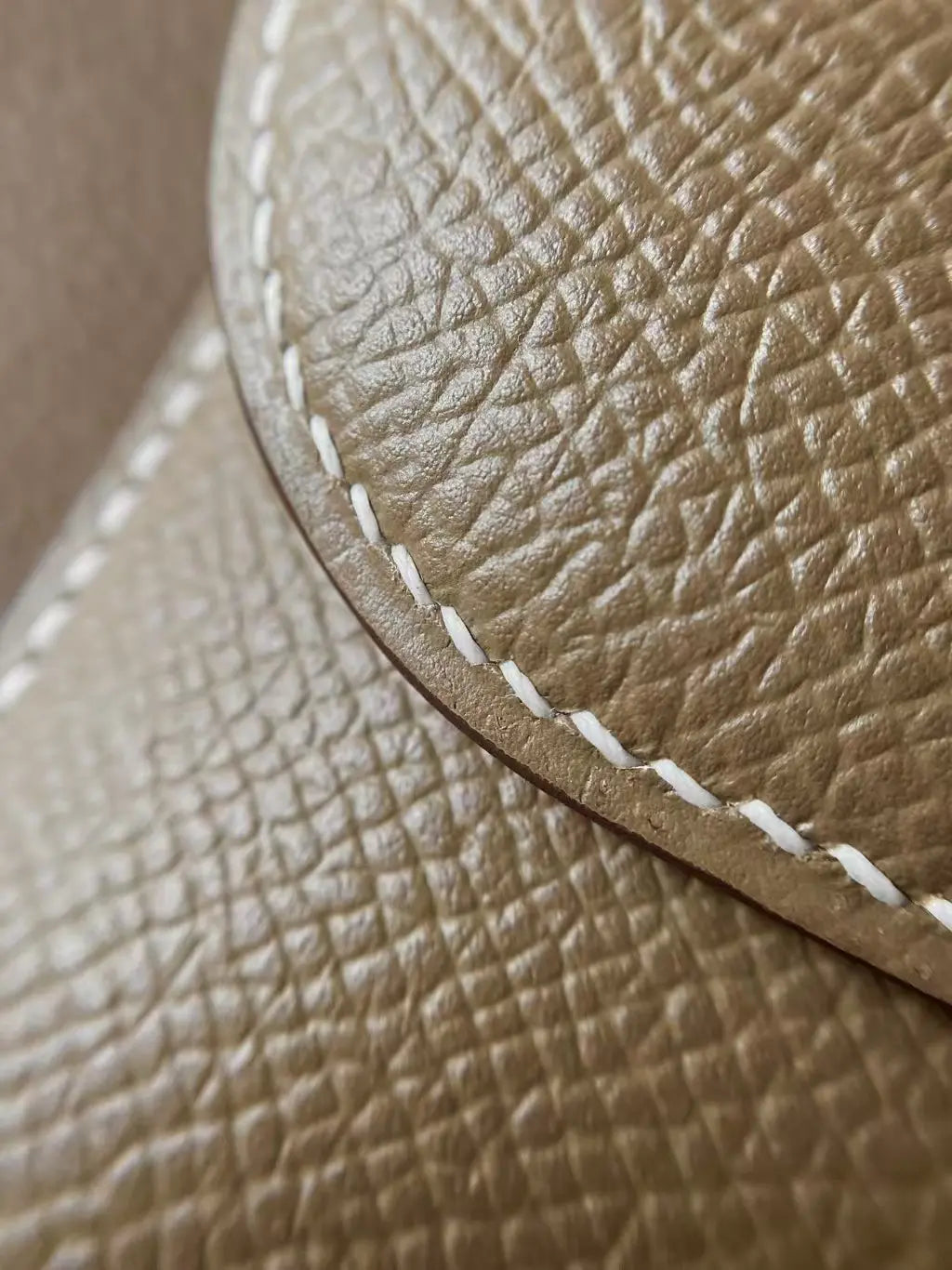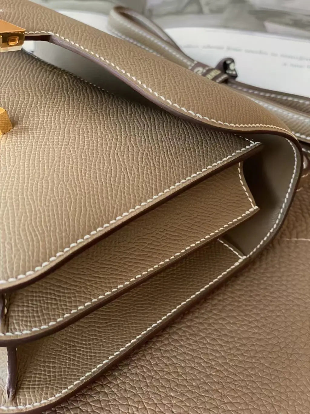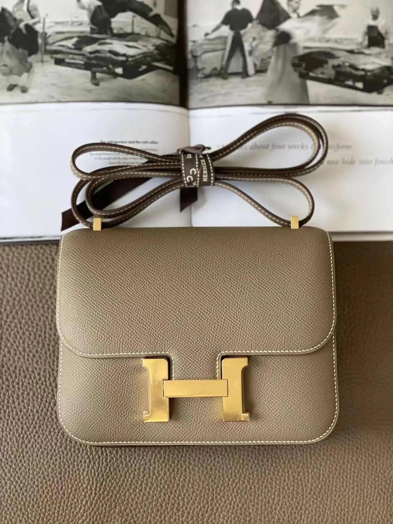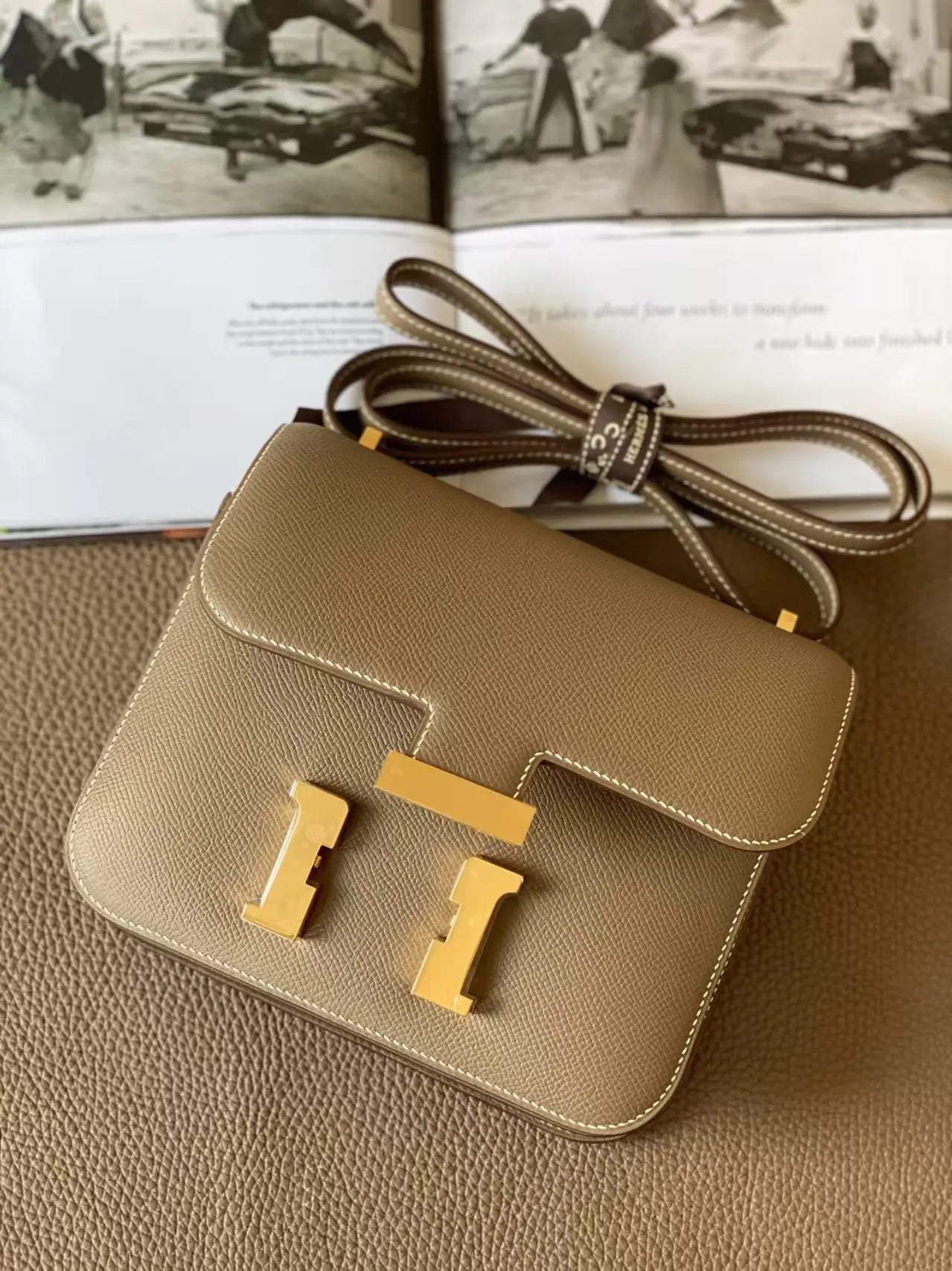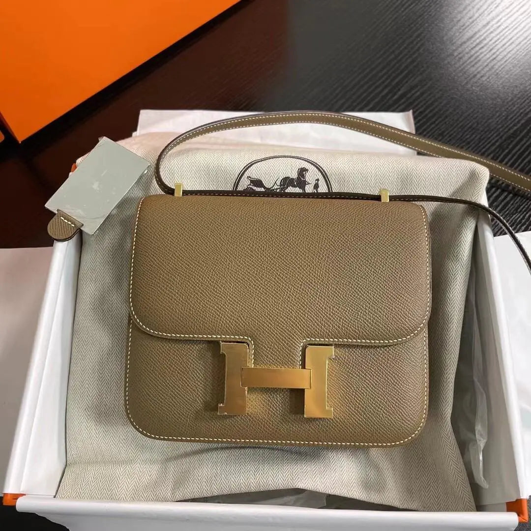 このコンスタンスは、エトゥープ産のエプソムレザーにゴールドの金具をあしらい、コントラストステッチ、メタルの「H」スナップロック留め、調節可能なショルダーストラップが特徴です。