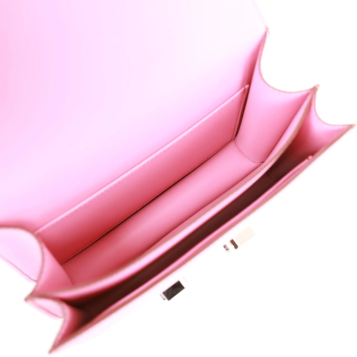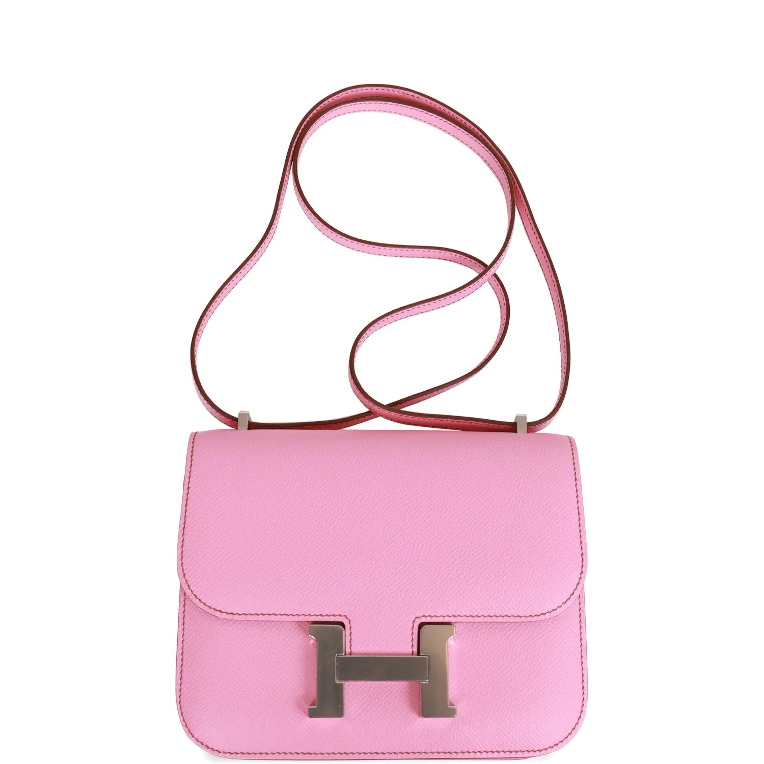 このコンスタンスは、バブルガムカラーのエプソムレザーにパラジウム金具をあしらい、コントラストステッチ、メタルの「H」スナップロック留め、調節可能なショルダーストラップが特徴です。