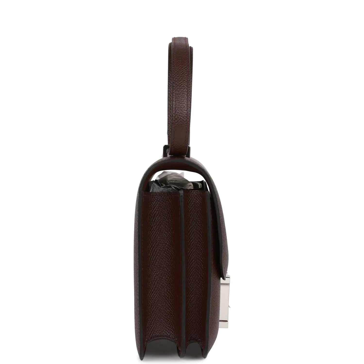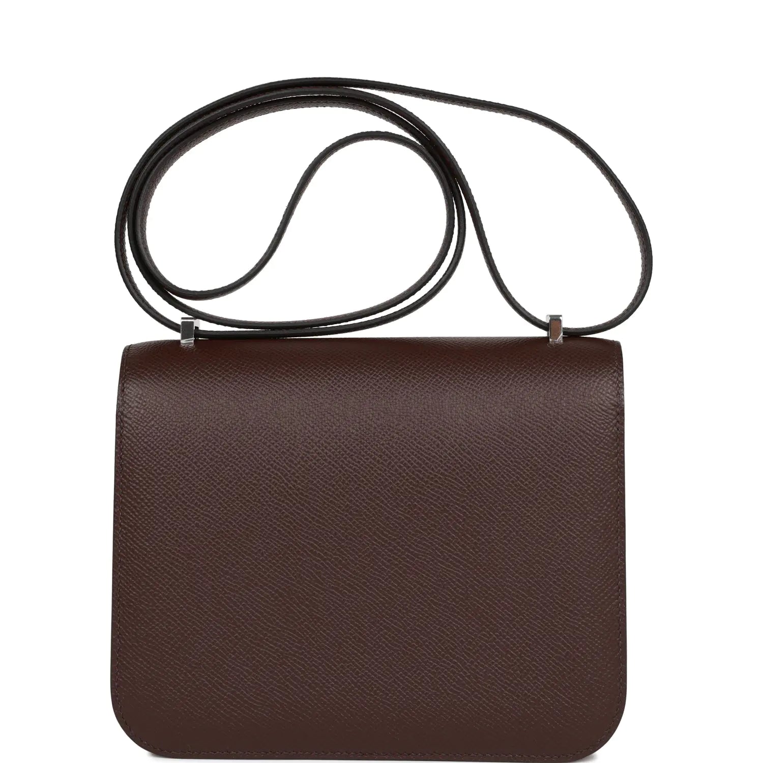 このコンスタンスは、ルージュ・セリエのエプソムレザーにパラジウム金具をあしらったデザインで、同系色のステッチ、フランボワーズエナメルとメタルの「H」スナップロック留め、そして調節可能なショルダーストラップが特徴です。