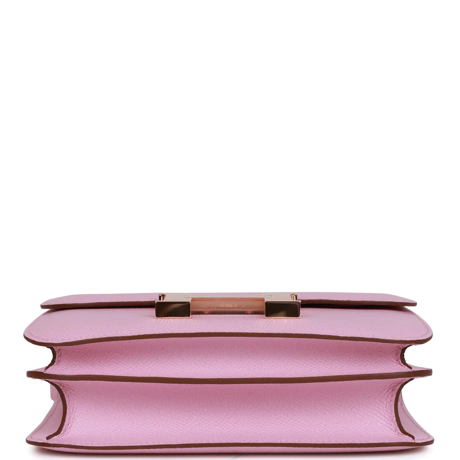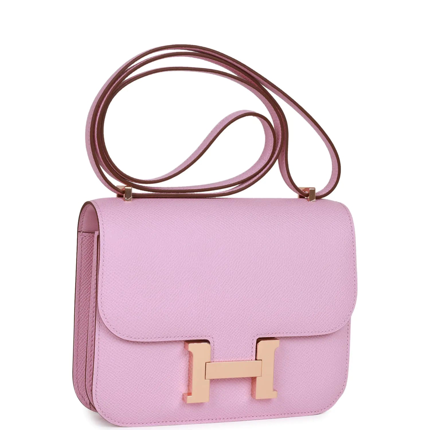 このコンスタンスは、モーヴ・シルベストル・エプソムレザーにローズゴールドの金具をあしらい、同系色のステッチ、メタルの「H」スナップロック留め、調節可能なショルダーストラップが特徴です。