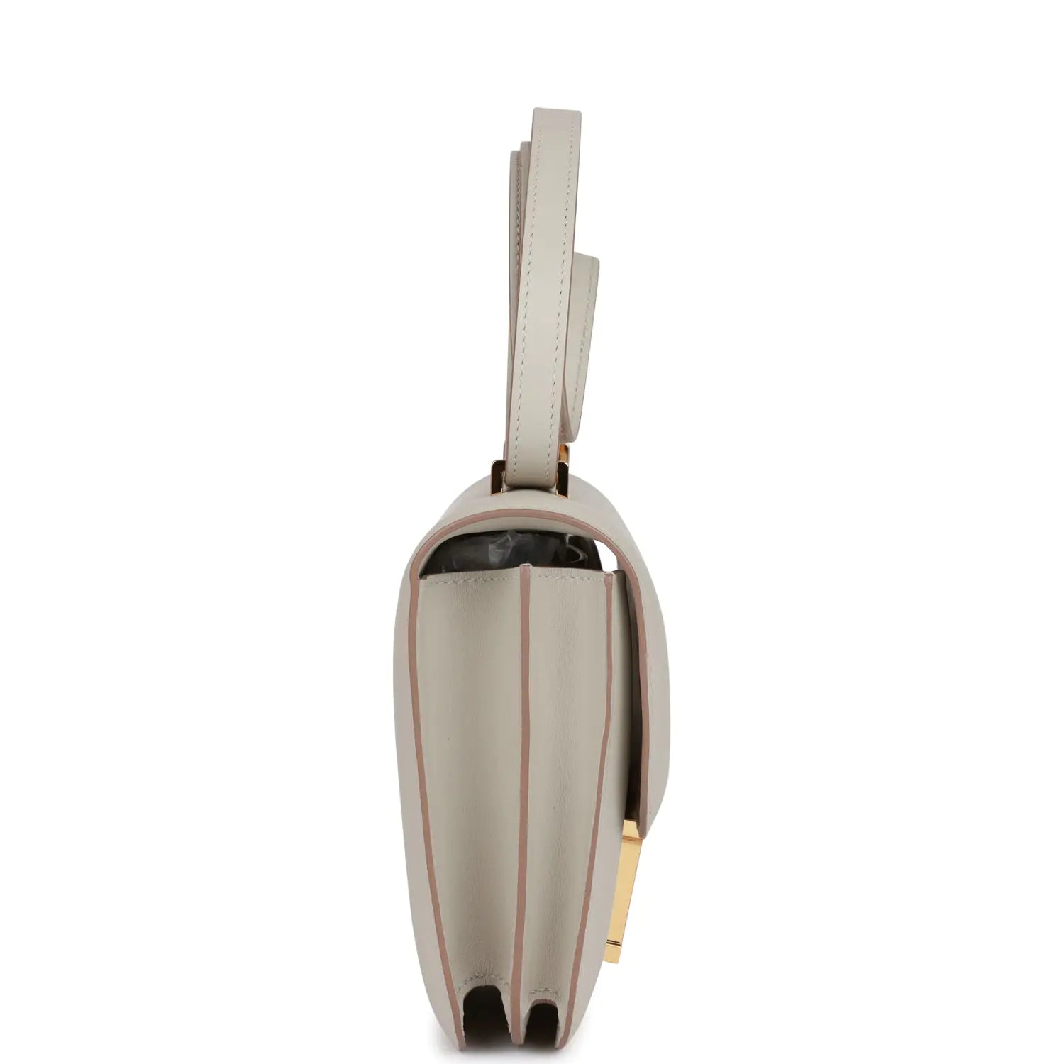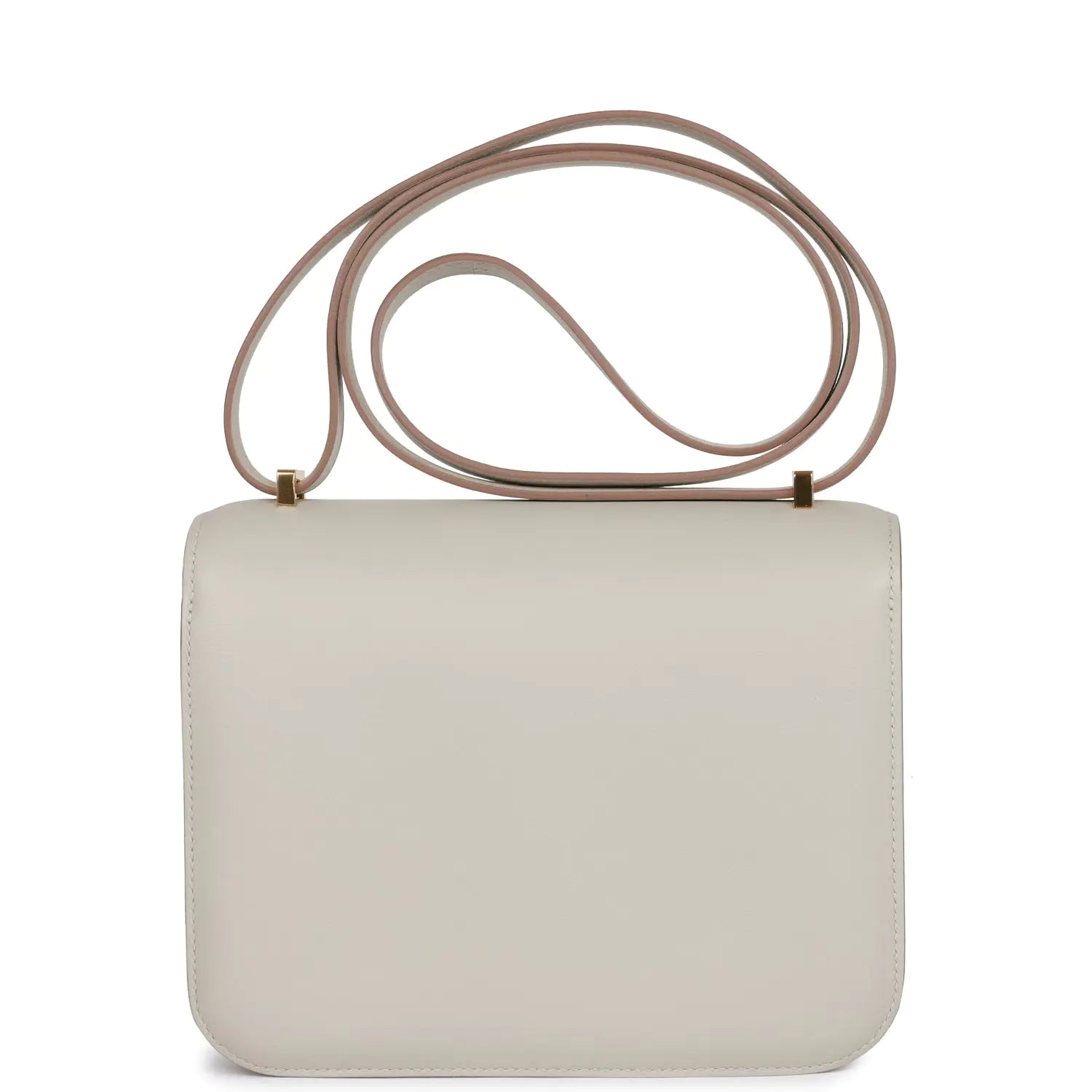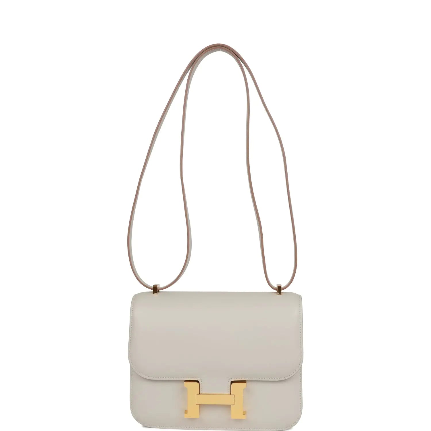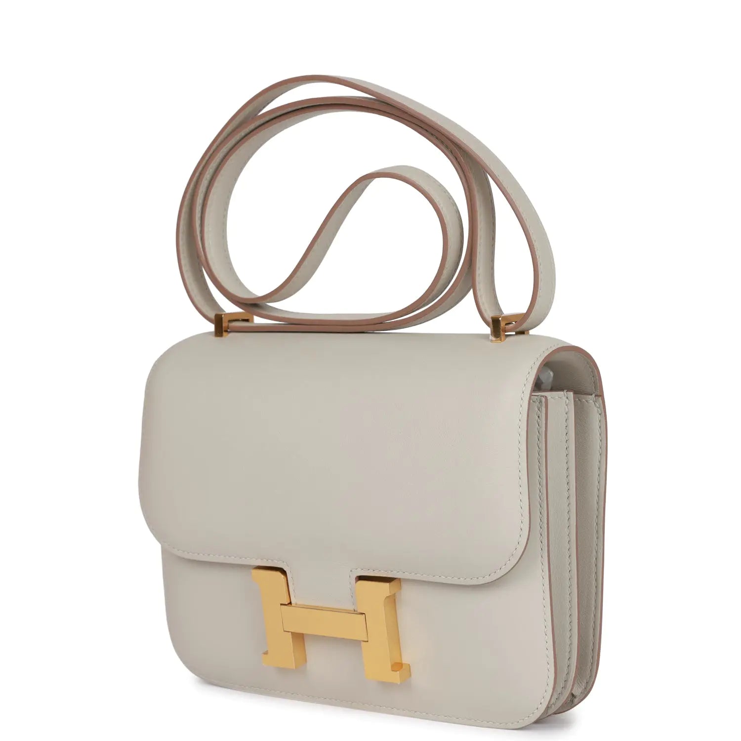 このコンスタンスは、グリ・ペルルのスイフトレザーにゴールドの金具をあしらい、同系色のステッチ、メタルの「H」スナップロック、そして調節可能なショルダーストラップが特徴です。