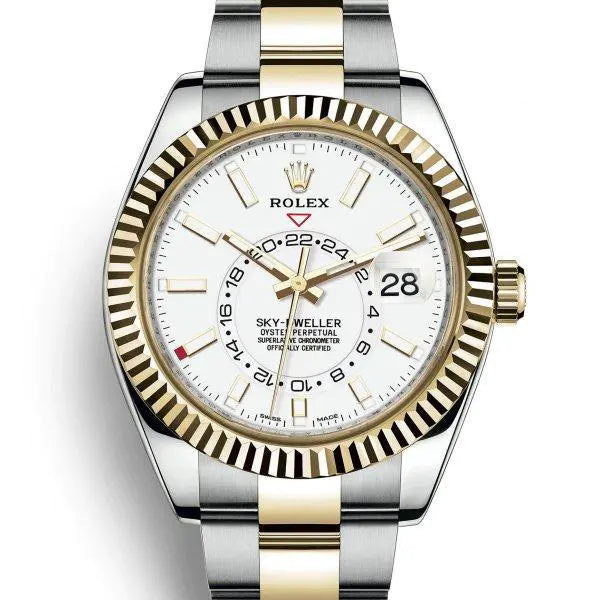 イエローロレゾールのオイスター パーペチュアル スカイドゥエラーは、ホワイトダイアルとオイスターストラップを備えた時計で、ダイアル上のオフセンターに配置したディスクで第2タイムゾーンを表示する。
