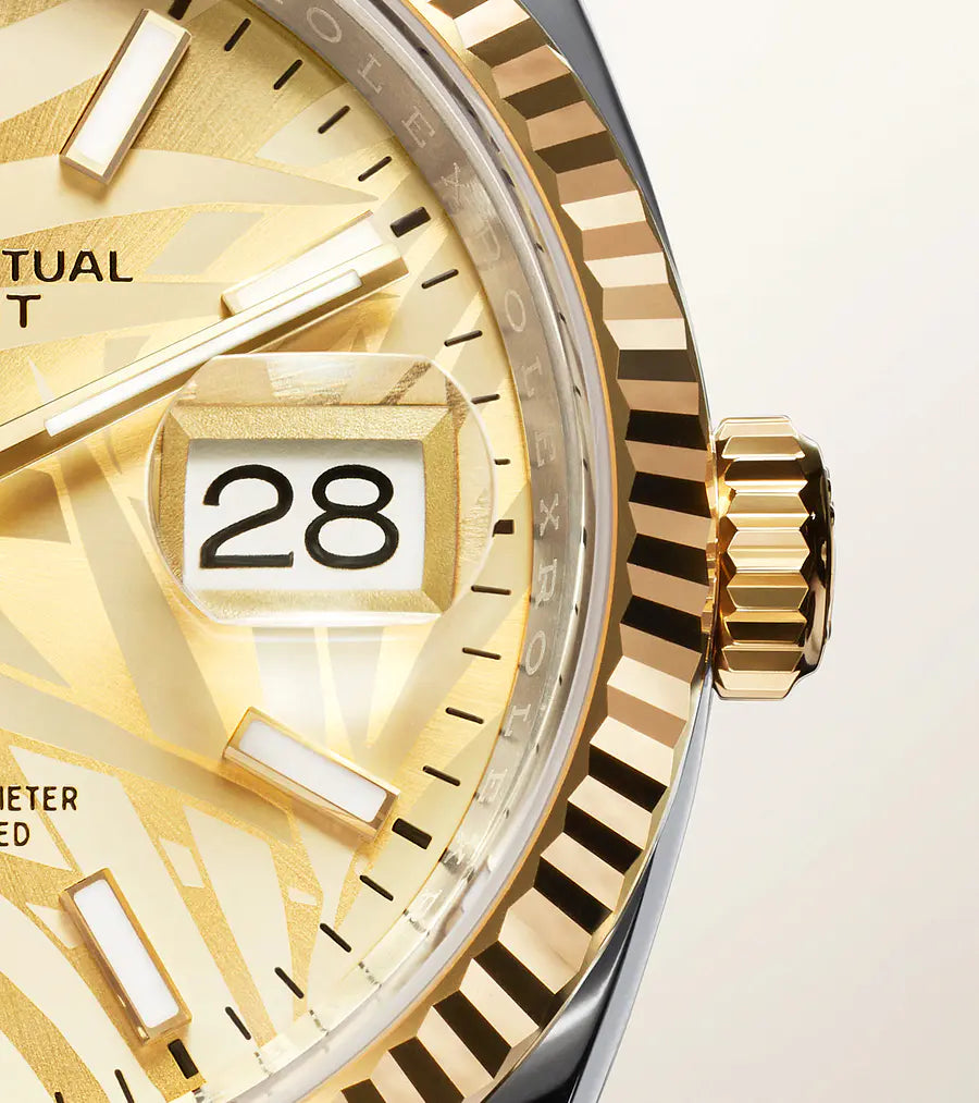 ロレックス フルーテッドベゼルは 卓越性の象徴。元来 オイスターベゼルの刻みにはベゼルをケースにねじ込み 時計の防水性能を確実にする機能的な目的があった。したがって その刻みはバックケースにも施されており 防水性能の維持という同じ理由で ロレックス独自のツールを用いてケースにねじ込まれていた。時を経て ベゼルの刻みはデザインの要素となり ロレックスのシンボルとなった。現在 フルーテッドベゼルは卓越性の象徴であり ゴールドのみで製造されている。