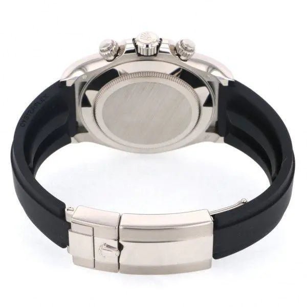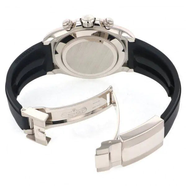 18 ct ホワイトゴールドのオイスター パーペチュアル コスモグラフ デイトナは、ブラック、ダイヤモンド入りダイアルとオイスターフレックスブレスレットを備え、ブラック セラクロムタキメーターベゼルが特徴的である。