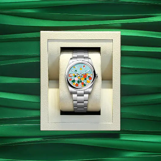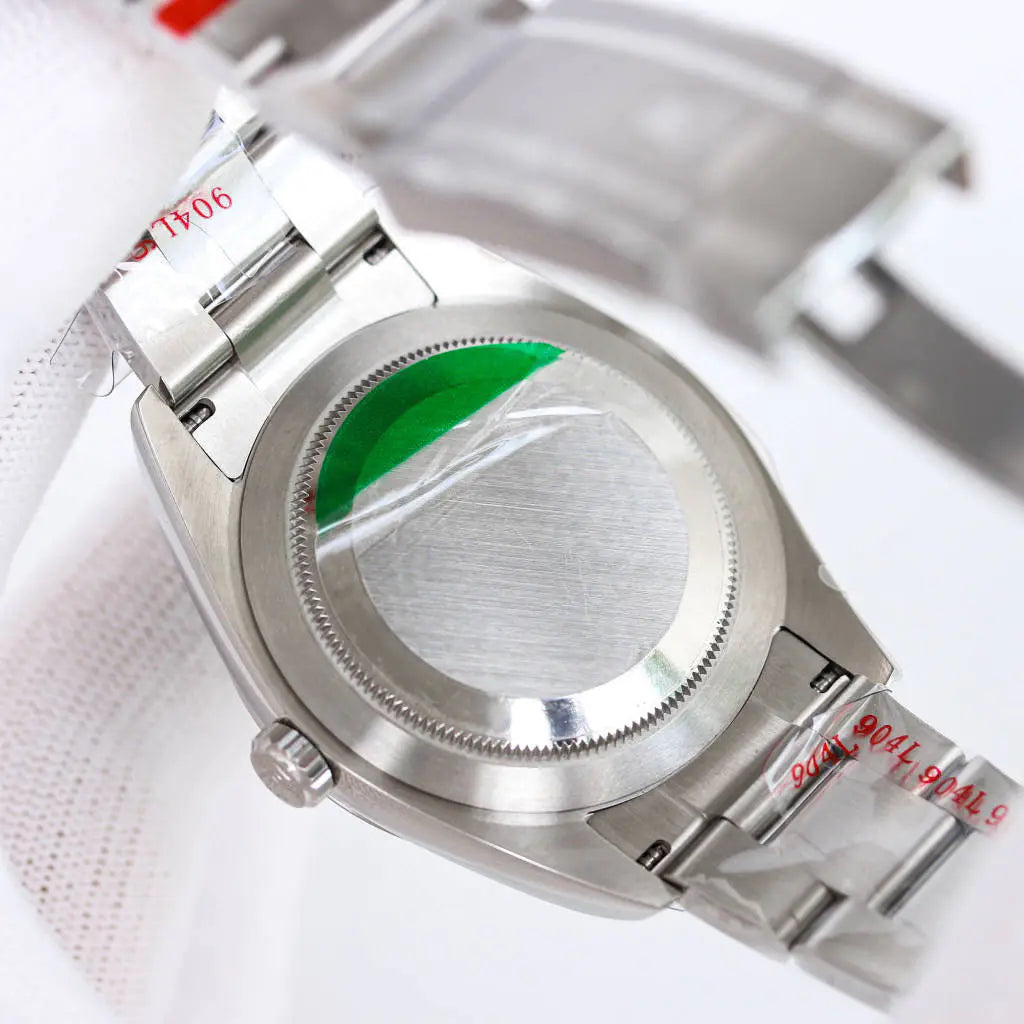 ストラップ:オイスタースチール製オイスターブレスレット(3列リンク / サテン仕上げ)、オイスタークラスプ(フォールディングタイプ)、イージーリンク(約5mmのエクステンションリンク)